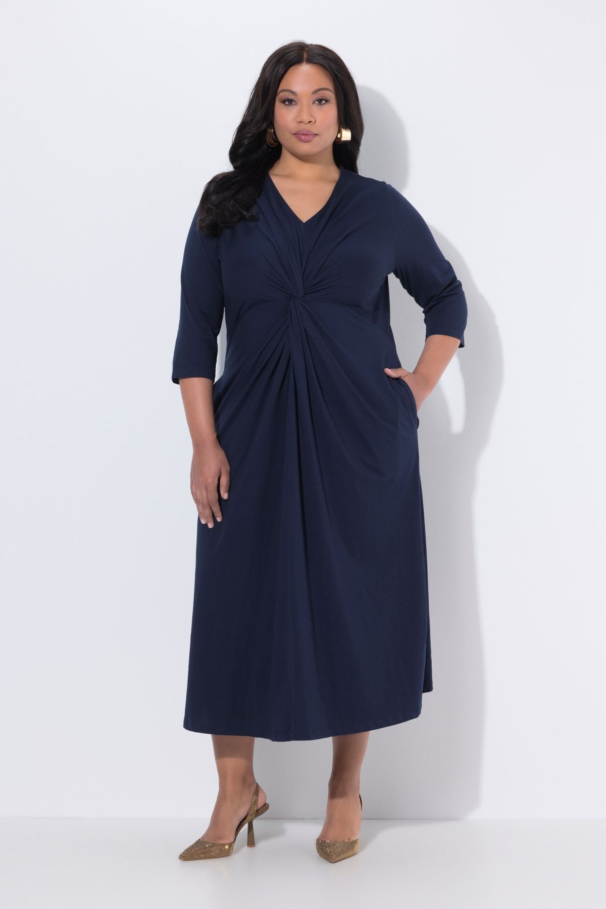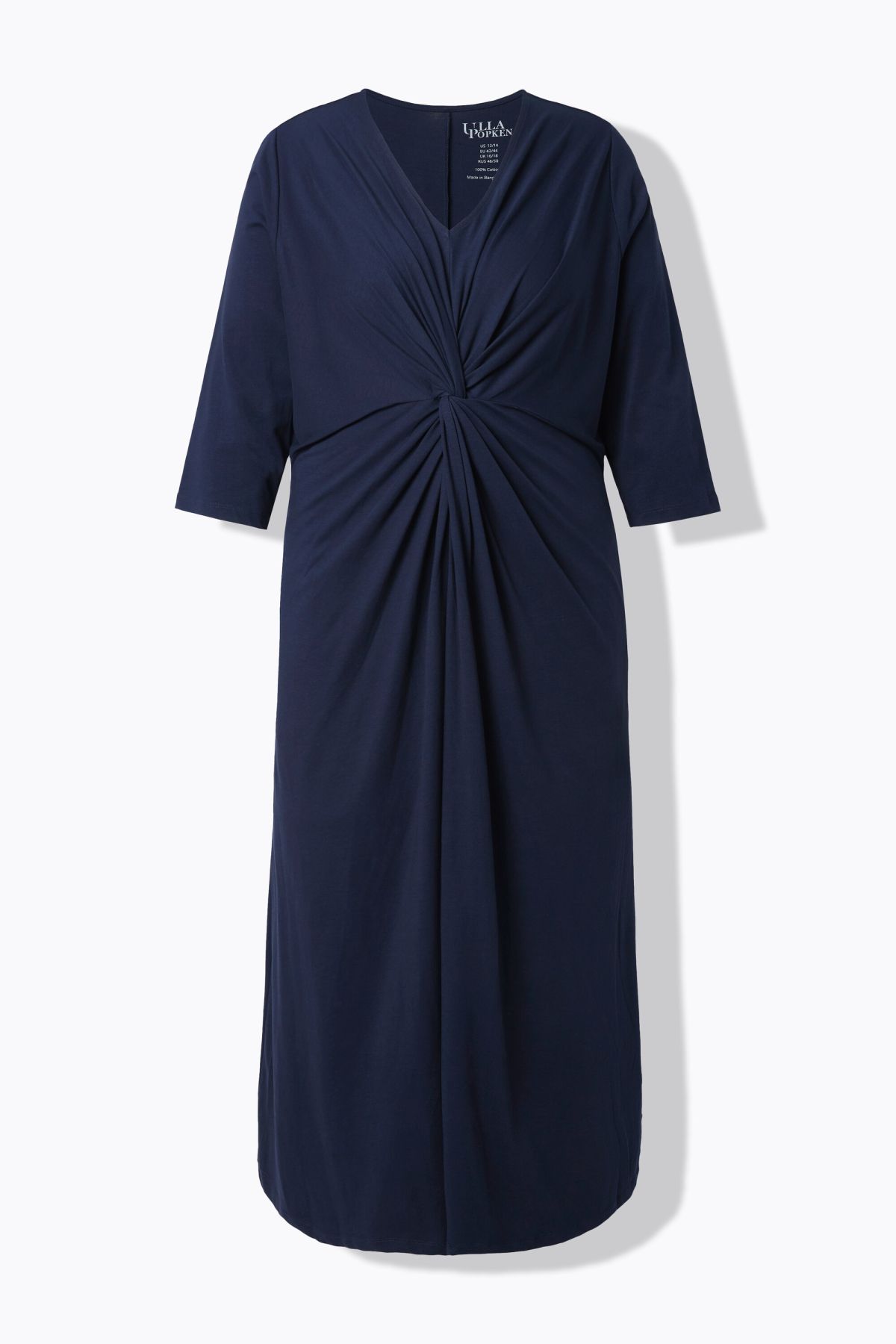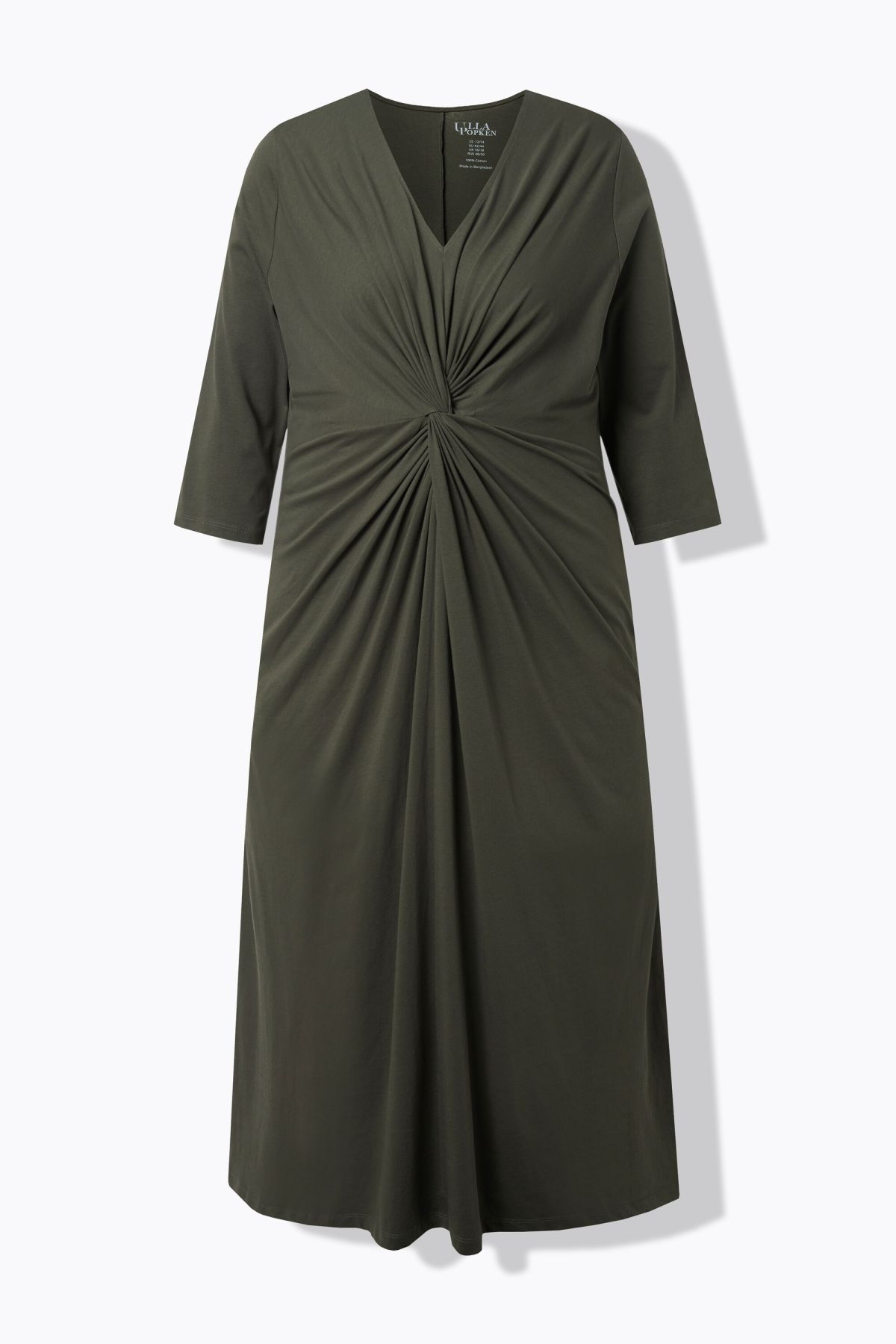 Élégant drapé, Décolleté en V, Coupe évasée confortable, poches latérales réservées dans la couture, Manches 3/4, Pur coton, Long. env. 127 cm.