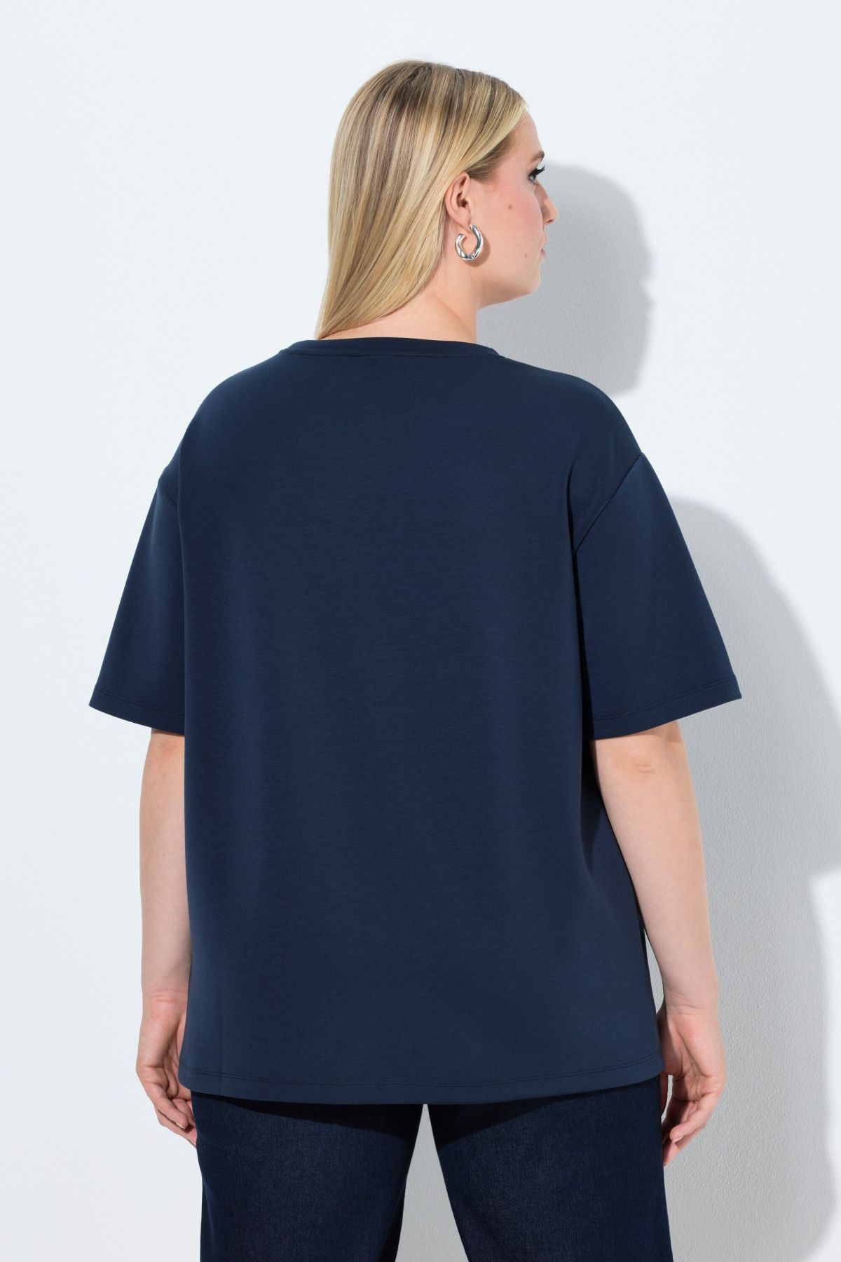 T-shirt décolleté en V et manches 3/4, manches avec bande en mesh habillée de paillettes