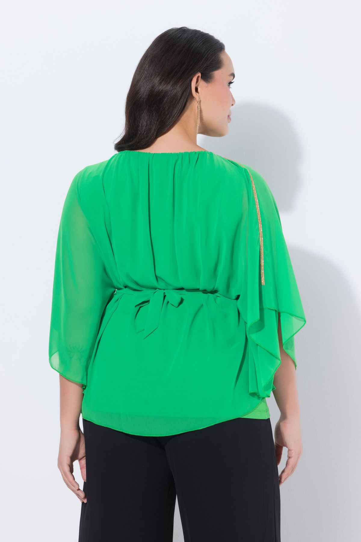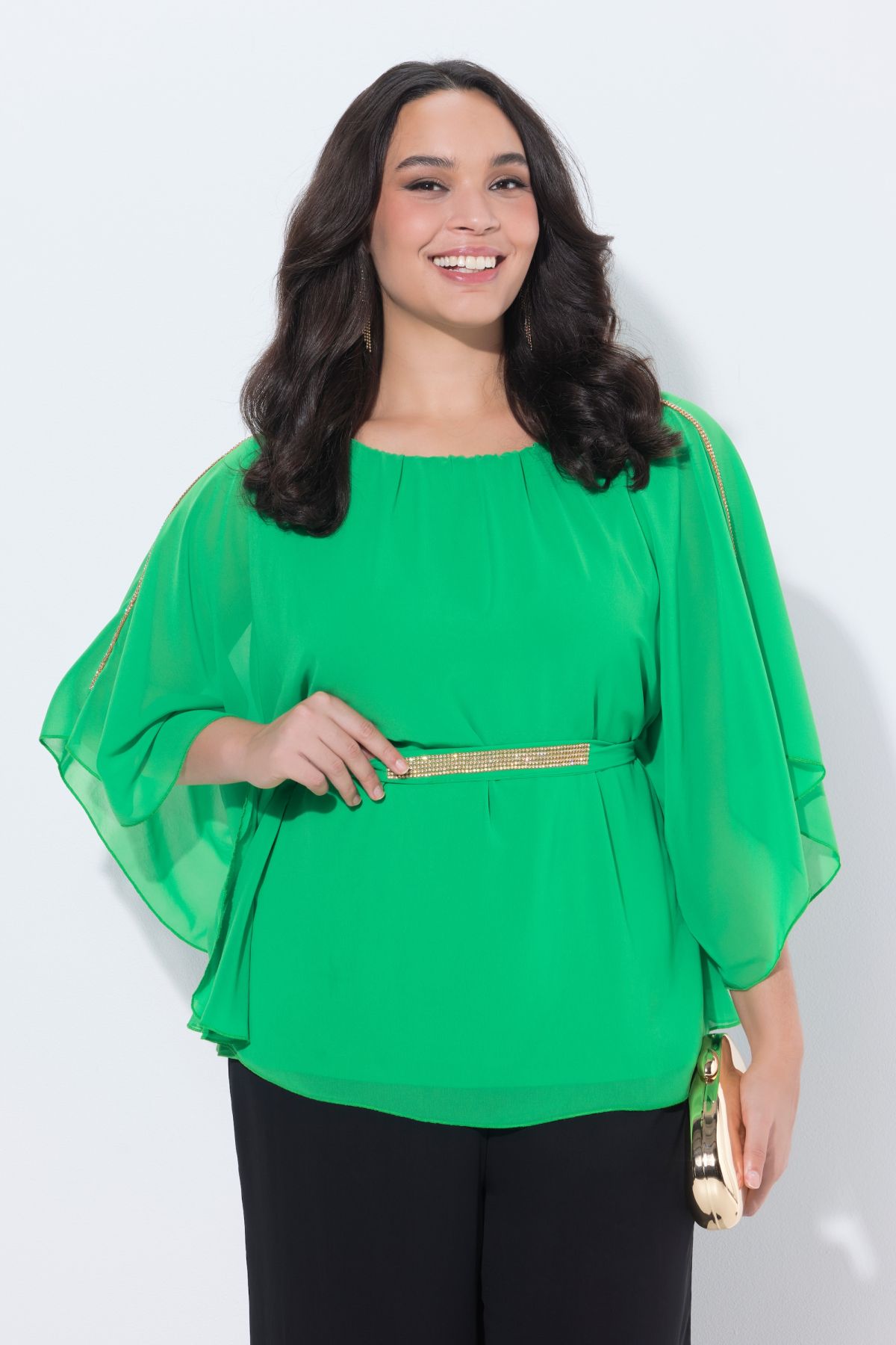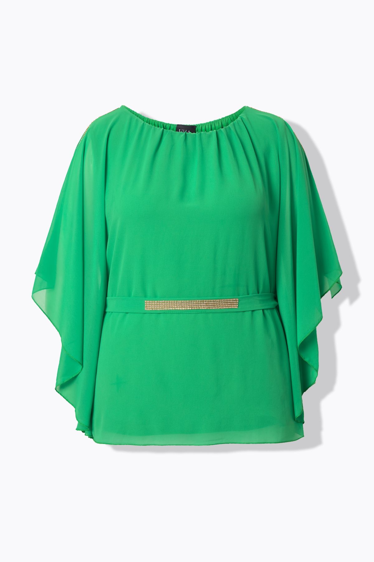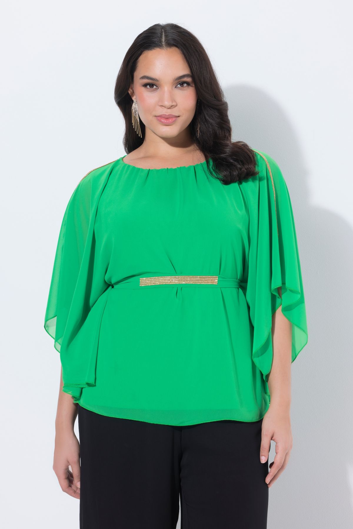 Mousseline raffinée, manches chauve-souris très amples, Encolure bateau élastique et froncée, Épaules basses, bande en petites pierres scintillantes courant le long des manches, Ceinture amovible, composée elle aussi de petits strass, Top en jersey opaque