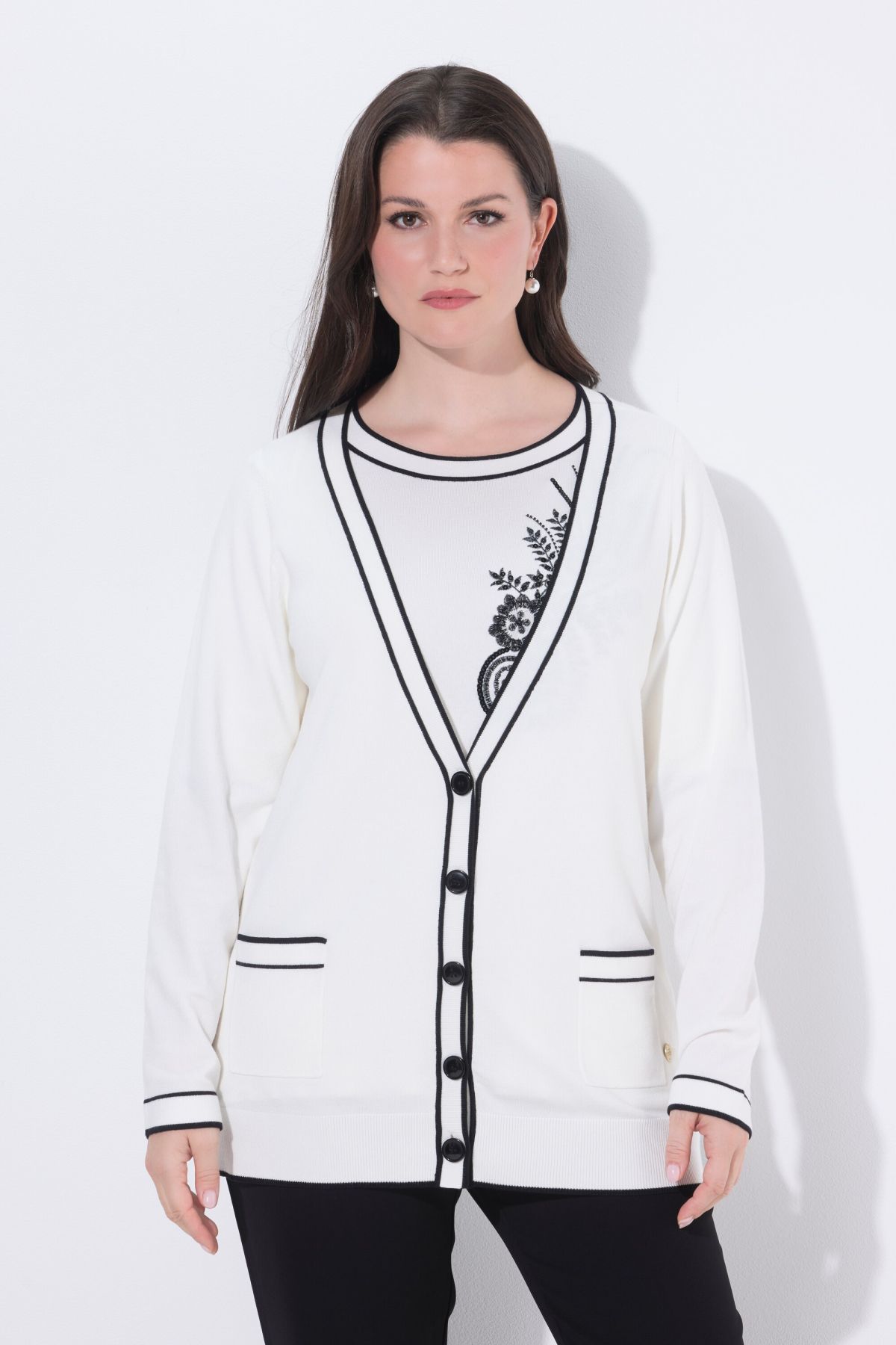 Maille fine en viscose douce et confortable, liserés noirs, Encolure en V, Coupe droite, patte de boutonnage, Poches plaquées, Pull twinset assorti : 847962201, Long. selon taille env. 72-76 cm.