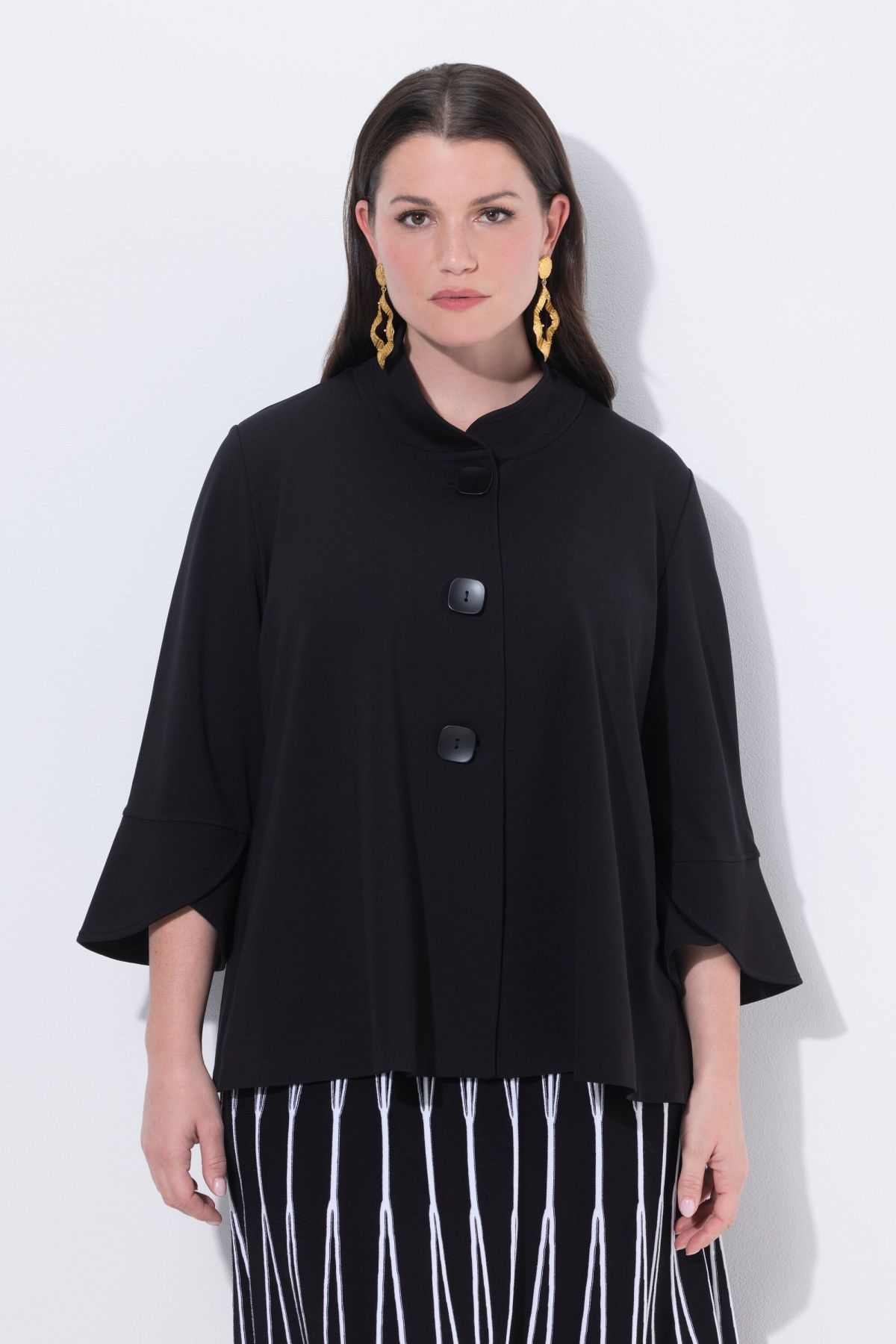 Superbes boutons fantaisie, Col montant, Coupe évasée courte et très ample, Larges manches 3/4 avec manchettes, Molleton point de Rome agréablement élastique, Long. selon taille env. 64-72 cm.