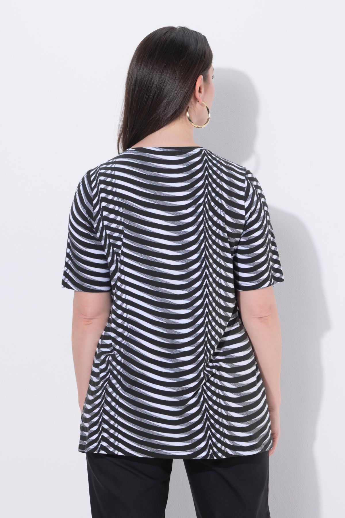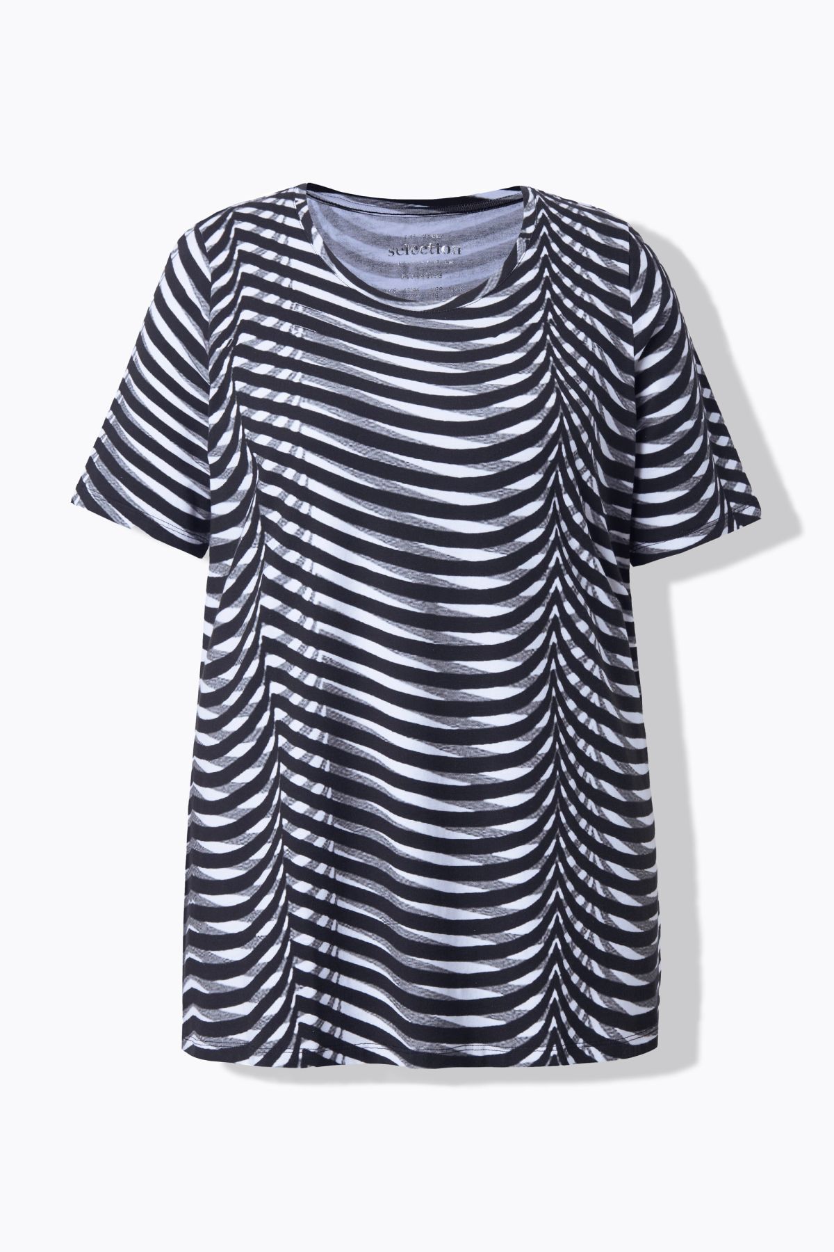 Motif à rayures tendance, Décolleté rond, Coupe évasée, base ample et confortable, Manches courtes, Coton Pima de très grande qualité, Long. selon taille env. 72-76 cm.