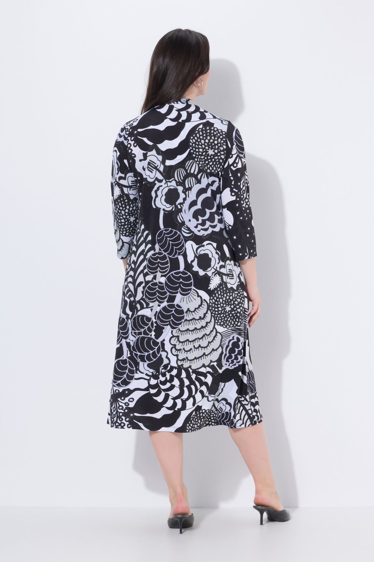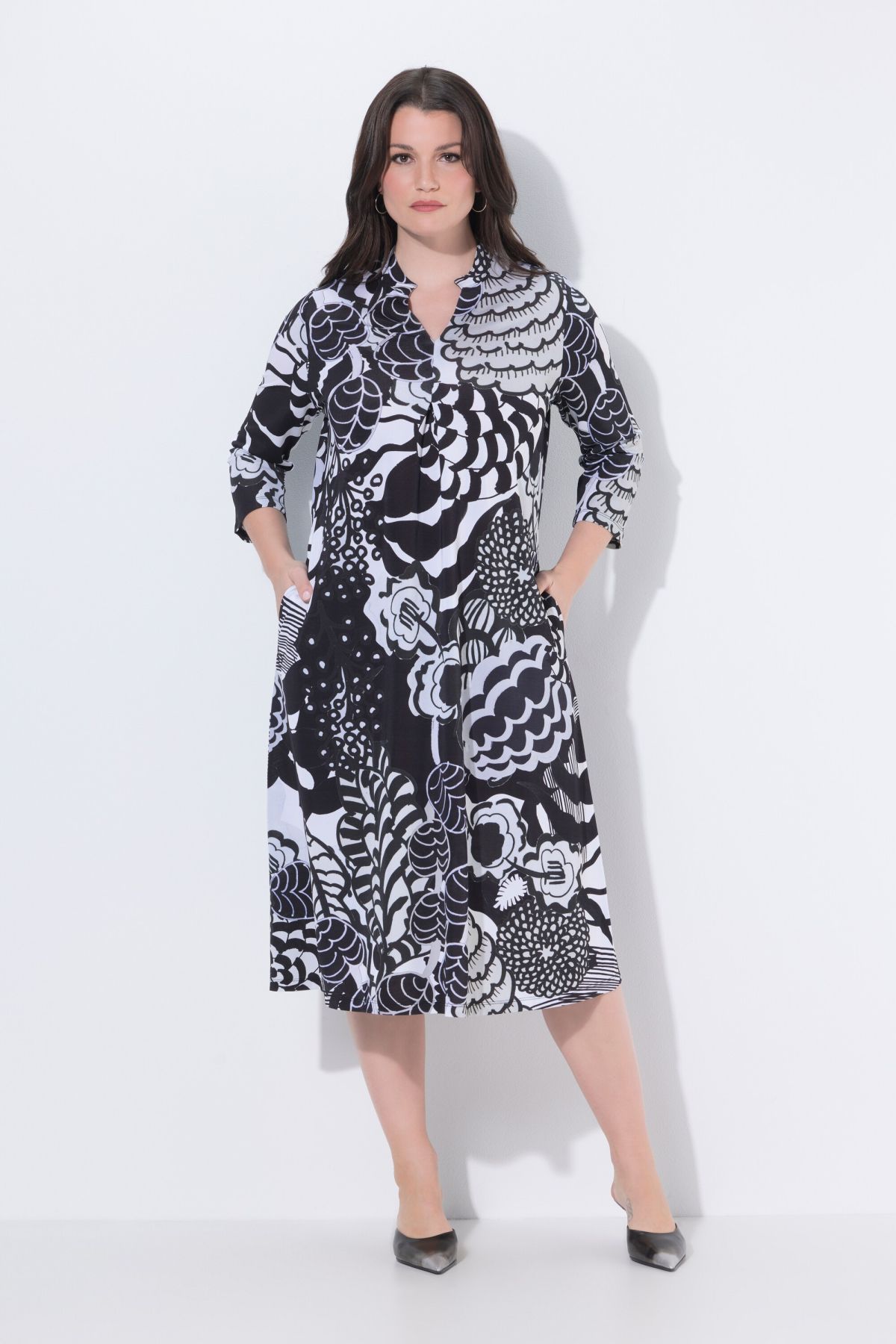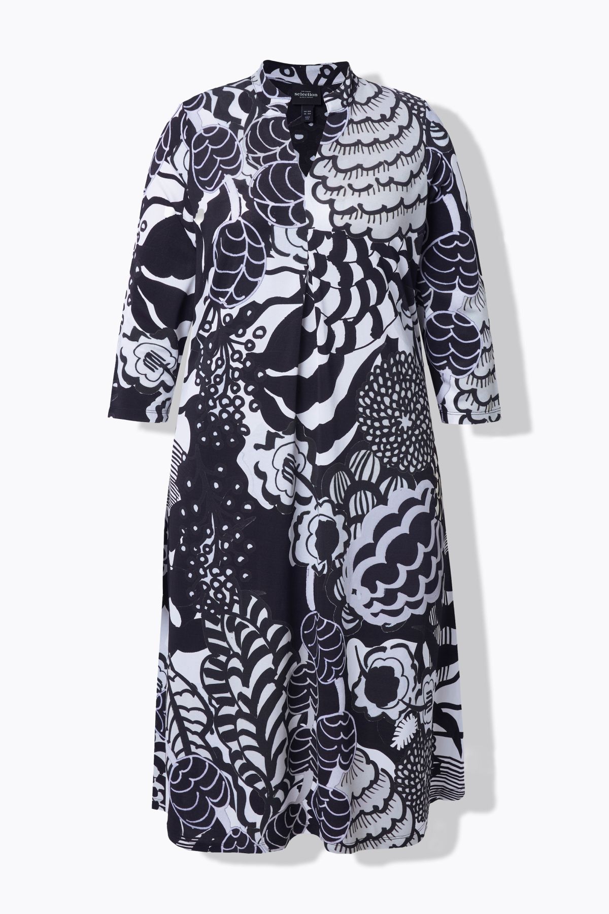 Motif graphique tendance, Col légèrement montant, décolleté en V et pli fantaisie, Coupe évasée confortable, poches latérales réservées dans la couture, Manches 3/4, Élégant tissu piqué au tombé fluide, texture raffinée, Long. env. 110-114 cm.