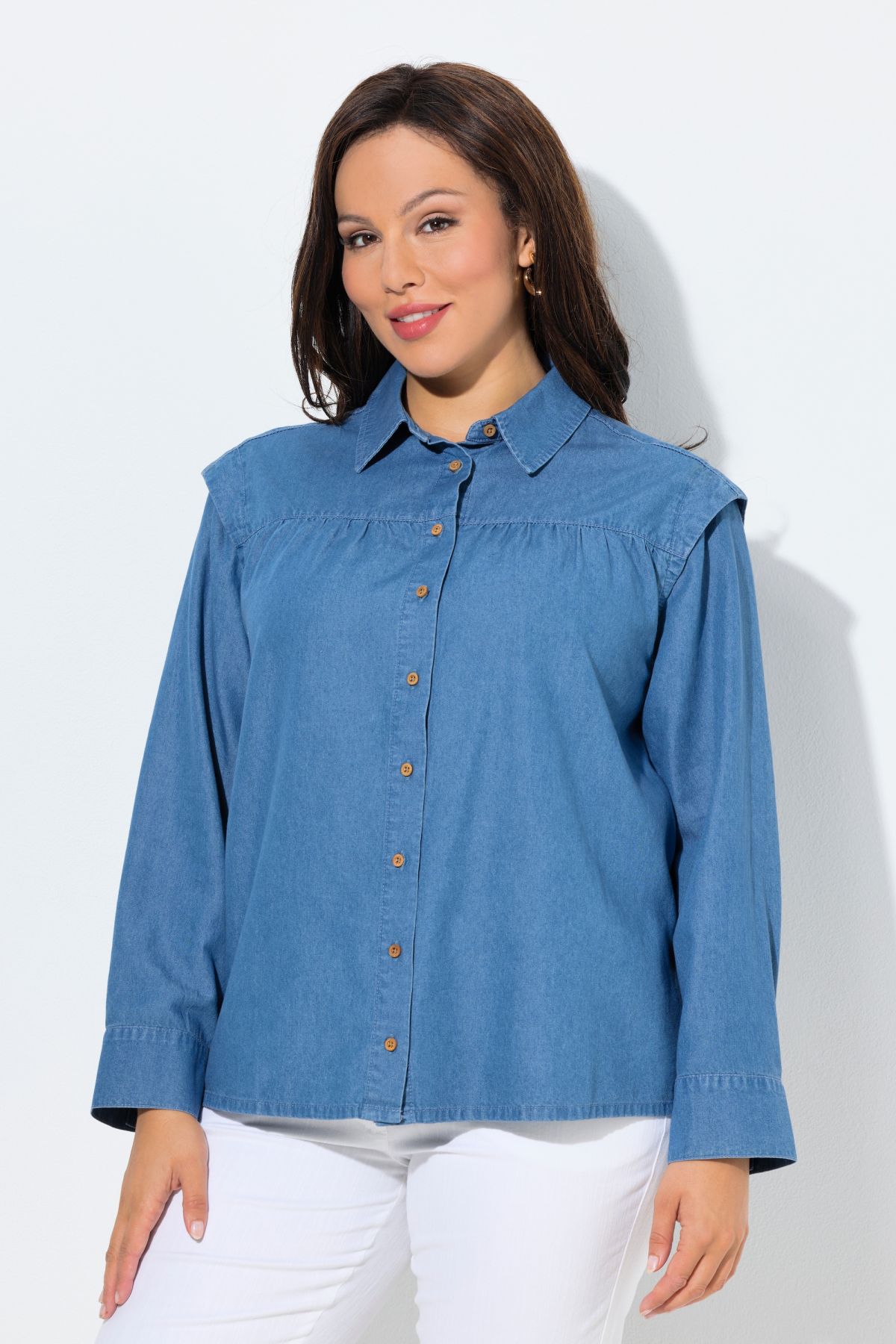 Chemisier en jean, épaules avec empiècement, col chemise et manches longues