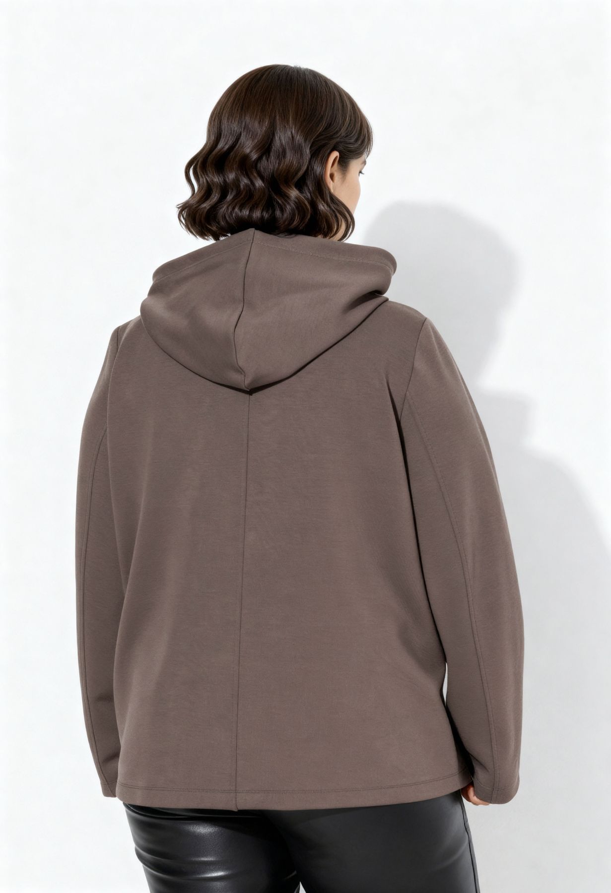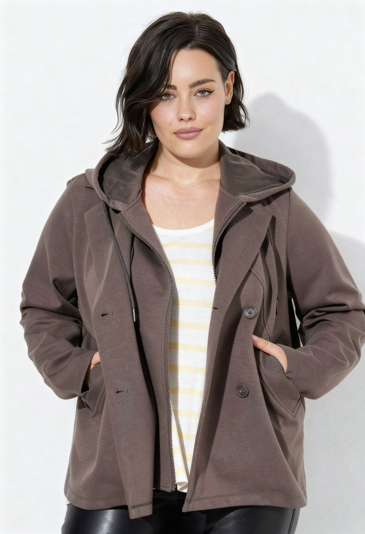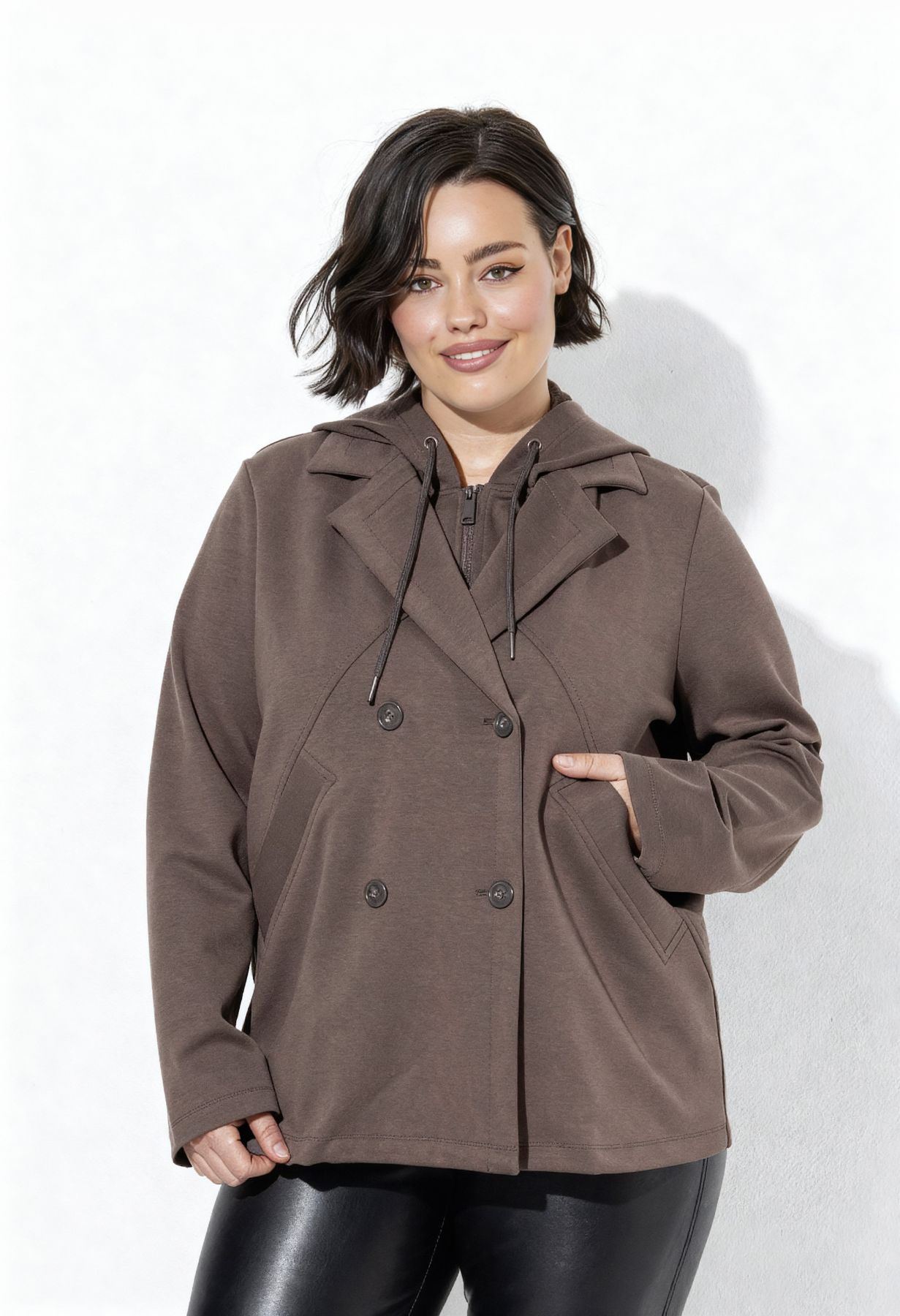 Point fort : capuche et col à revers, Coupe évasée confortable, Effet de superposition : empiècement avec fermeture à glissière et veste avec double rangée de boutons, Poches fendues sur les côtés, Tissu scuba doux et confortable, Long. selon taille env.