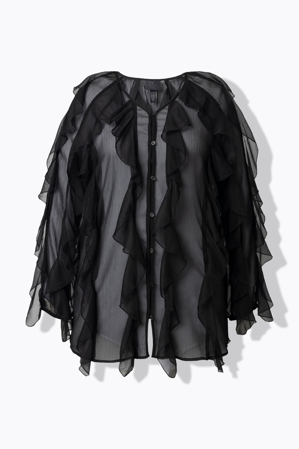 Bluse aus weicher Viskose mit romantischen Volants und V-Ausschnitt. Bequeme A-Linie mit Knopfleiste. Raglan-Langarm.