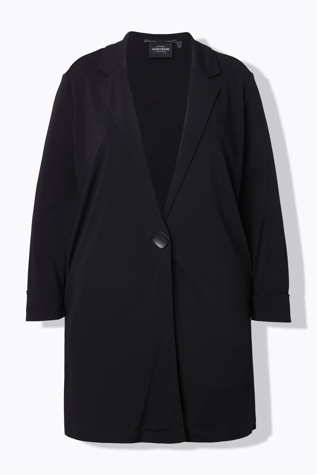 Élégant col à revers, Fermeture 1 bouton, Poches latérales réservées dans la couture, Fentes sur les côtés pour encore davantage de confort, Jersey de viscose agréablement élastique, Long. env. 87 cm.