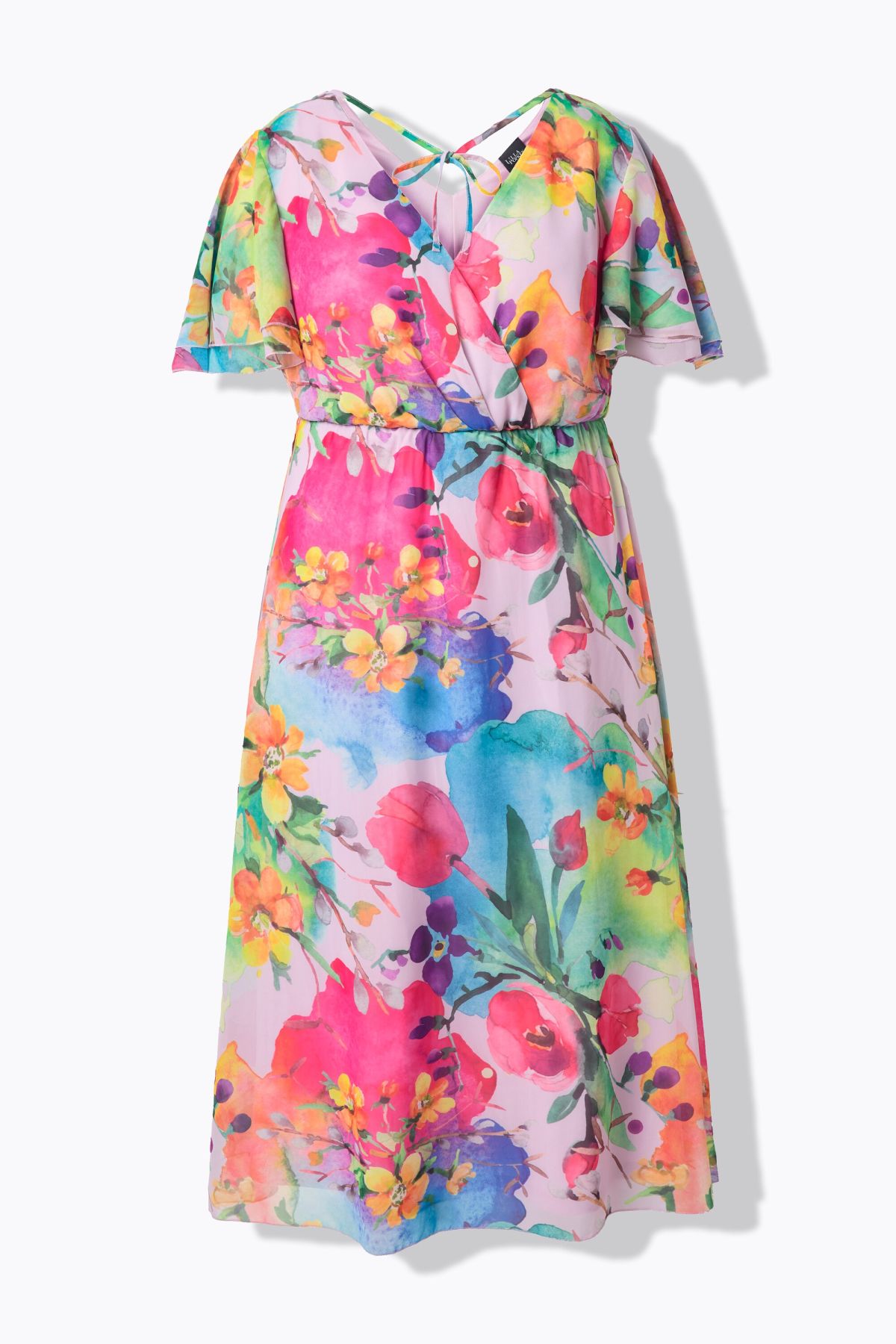 Maxi-Chiffonkleid mit farbigem Blütenmuster. V-Ausschnitt mit Wickeloptik bis zum elastischen Tunnelzug in der Taille - immer deine Wunschsilhouette. V-Ausschnitt mit Bindeband im Rücken. Doppellagiger Flügel-Halbarm. Bequeme Saumweite, blickdichtes Jersey-Unterkleid.