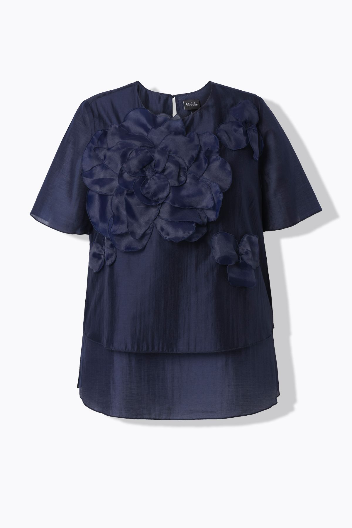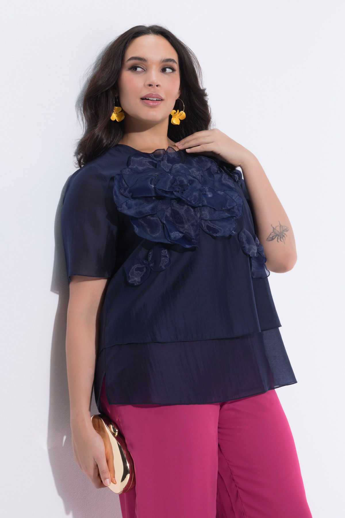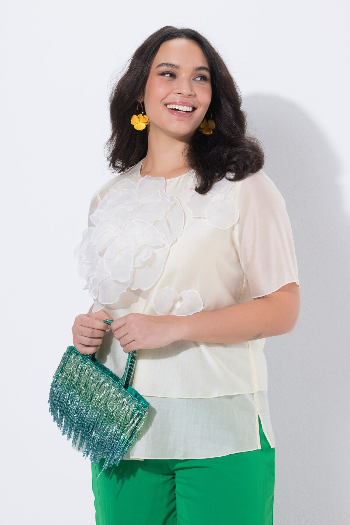 Mousseline raffinée, effet de superposition, Applications grandes fleurs sur le devant, Décolleté rond, Fente et bouton dans le dos, Coupe évasée confortable, Long. selon taille env. 68-73 cm.
