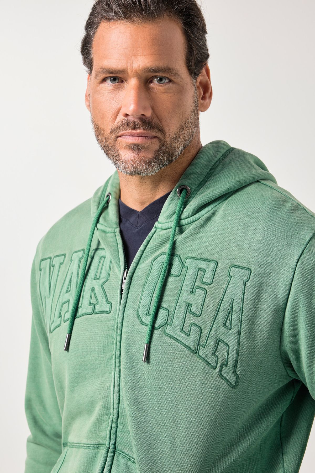Coupe spéciale jusqu'au 8 XL, Molleton lisse, ne peluche pas, Capuche, Flocage sur la poitrine, Long. selon taille env. 74-86 cm.