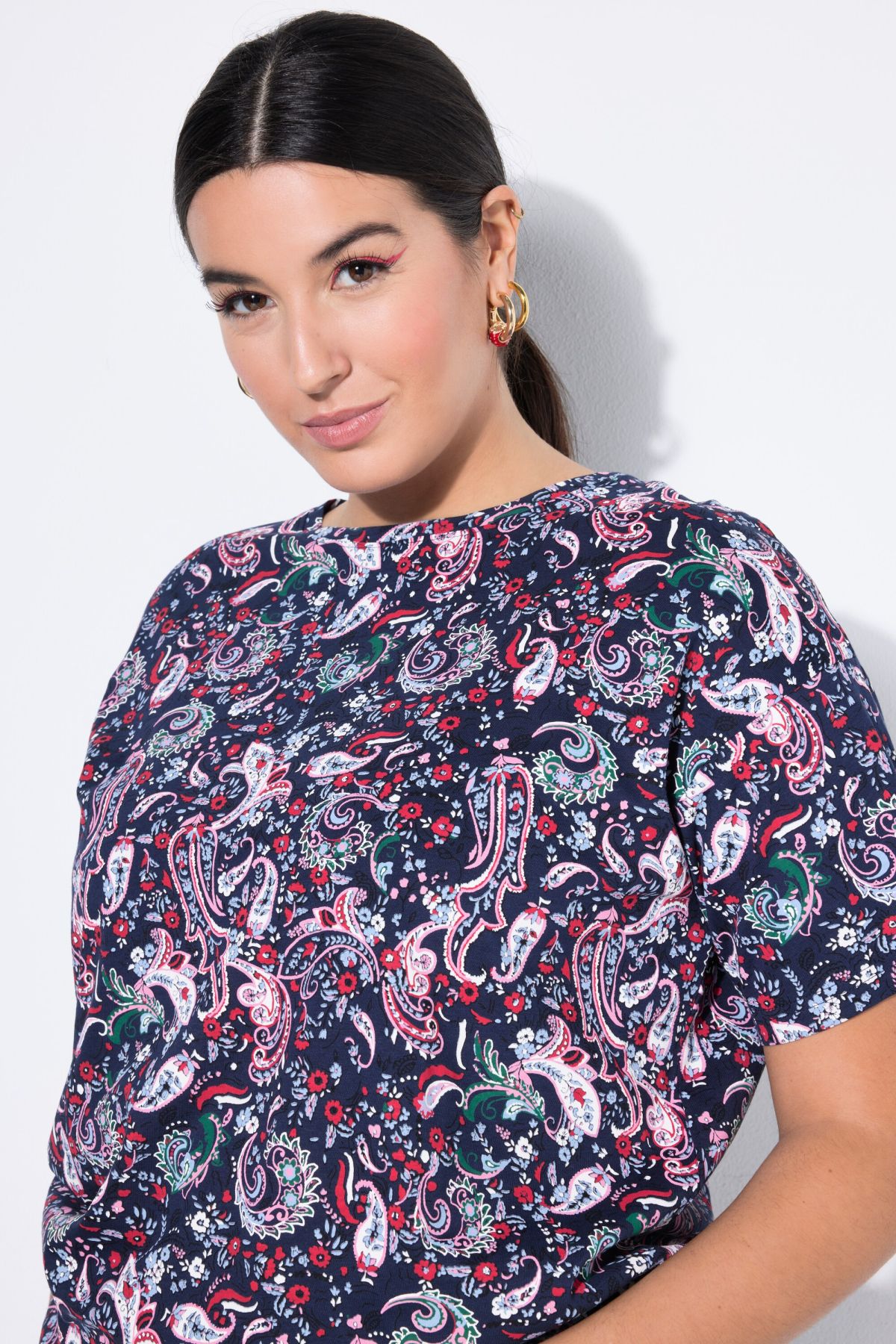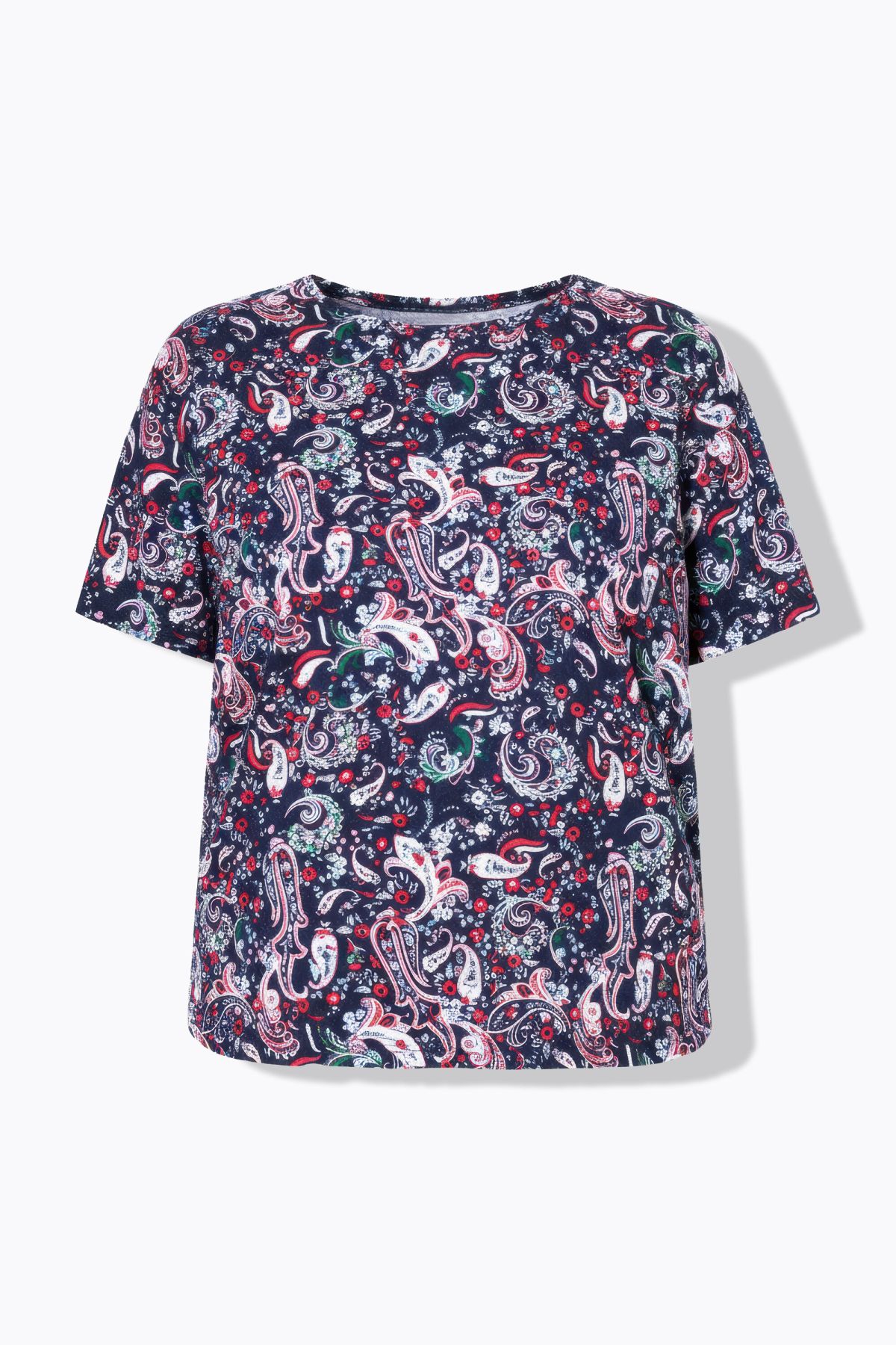 Coupe oversize, Jersey doux et confortable, Motif cachemire, Manches courtes, Long. selon taille env. 65-73 cm.