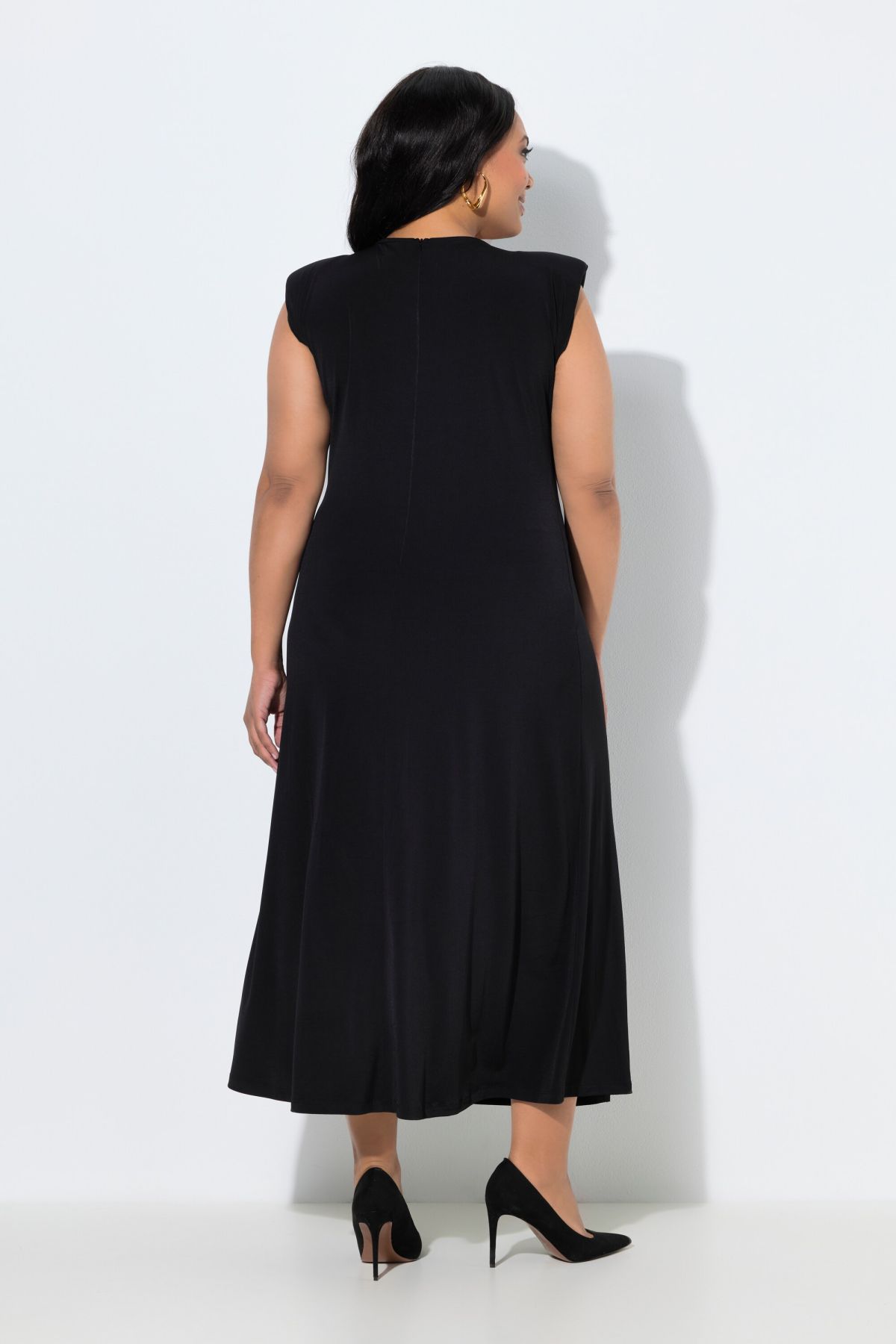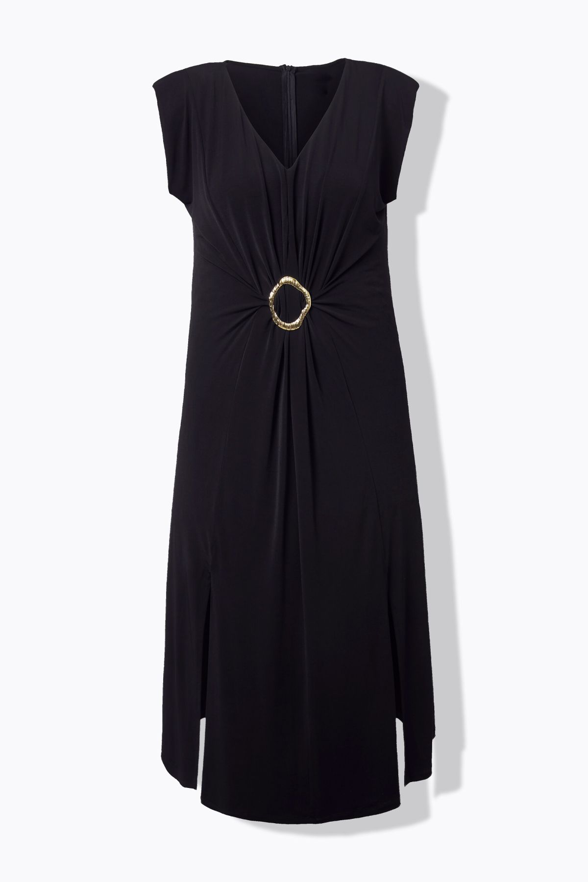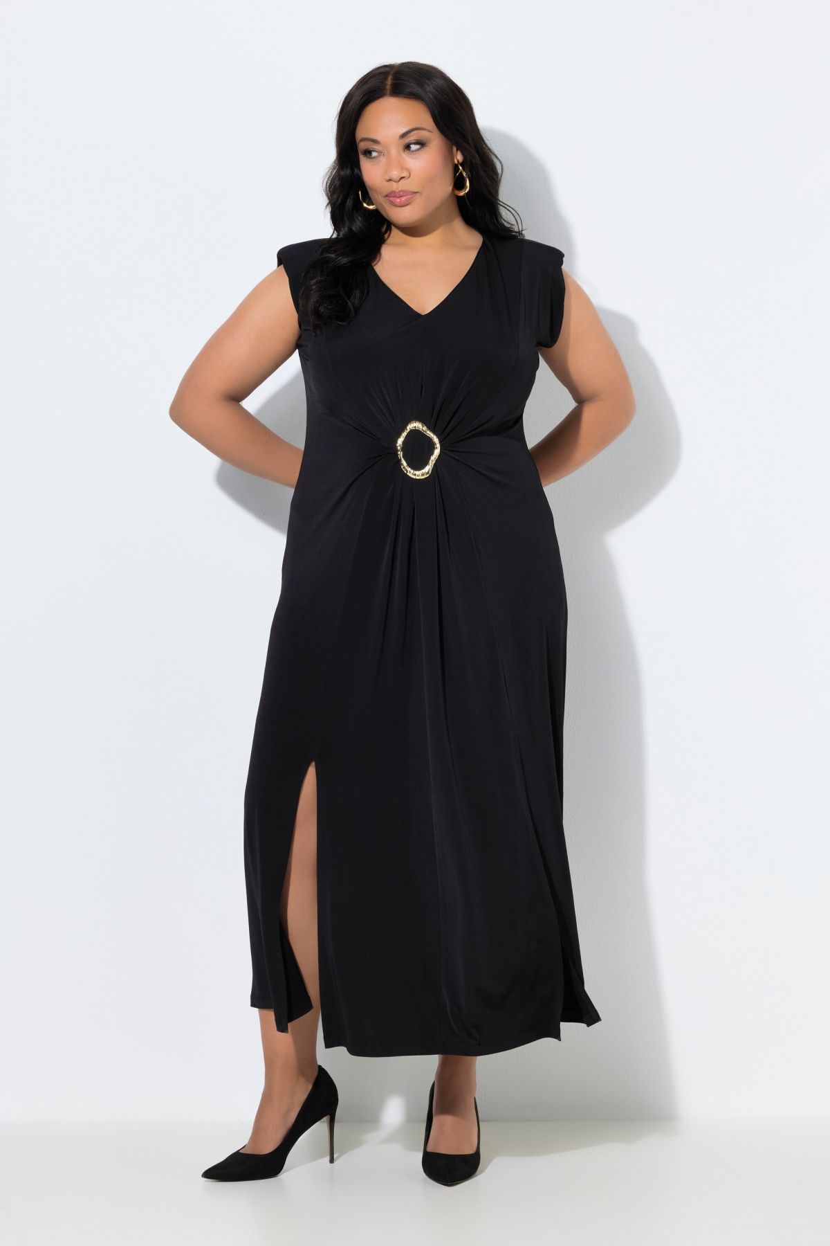 Maxi-Jerseykleid mit Drapierung und glänzender Zierschnalle vorne in der Taille. V-Ausschnitt, im Nacken mit Zipper. Überschnittene Schultern, durch Schulterpolster modisch betont. Lange Saumschlitze - noch mehr Tragekomfort.