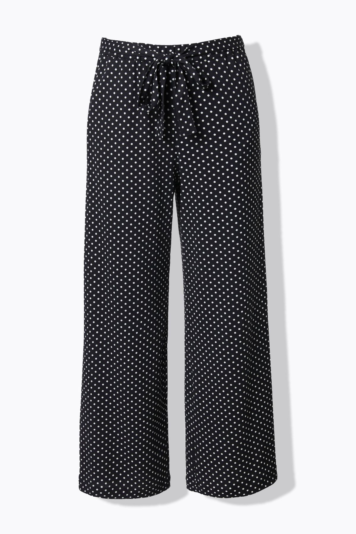 Jerseyhose, weites, gerades Bein, aus angenehm elastischem Jersey mit Struktur und modischen Polka-Dots. Elastikbund mit Bindegürtel und seitlichen Taschen.