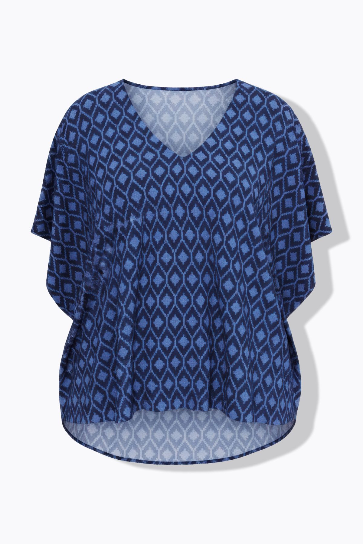 Coupe oversize, Motif losanges, Col en V, Base arrondie, Long. selon taille env. 74-78 cm.
