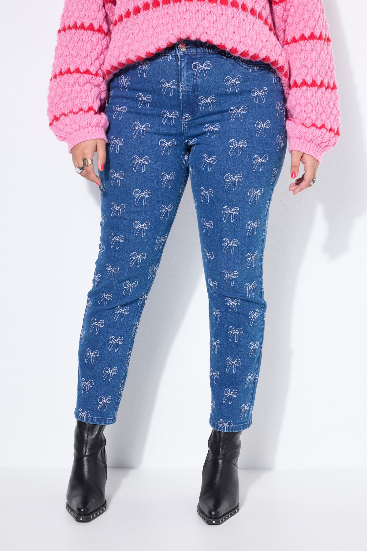 Coupe Mom décontractée, En jean stretch souple, Élégant nœud fantaisie brodé, Modèle 5 poches, Taille élastique avec passants pour ceinture, Entrej. env. 74 cm.