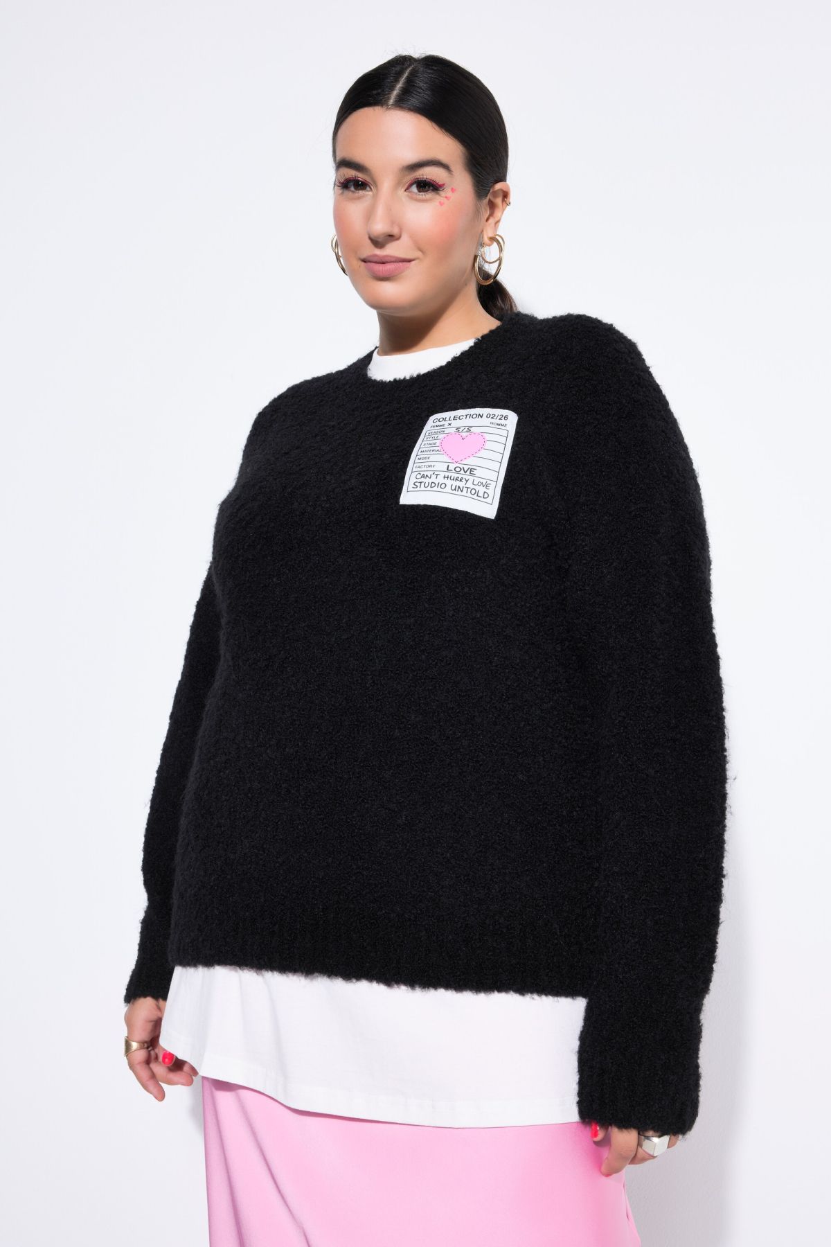 Coupe large oversize décontractée, Maille bouclée fine et douce, Patch cœur sur la poitrine, Manches longues, Finitions bords-côtes, Long. selon taille env. 68-76 cm.