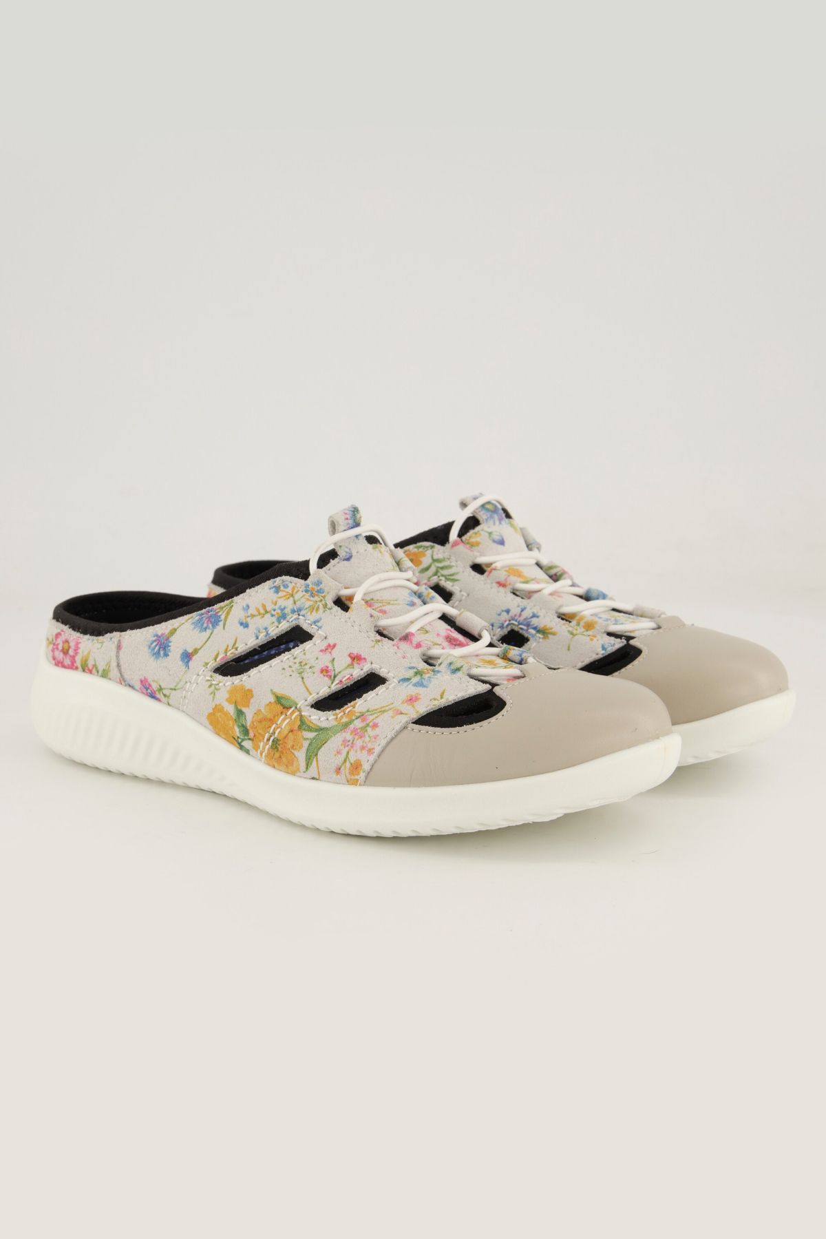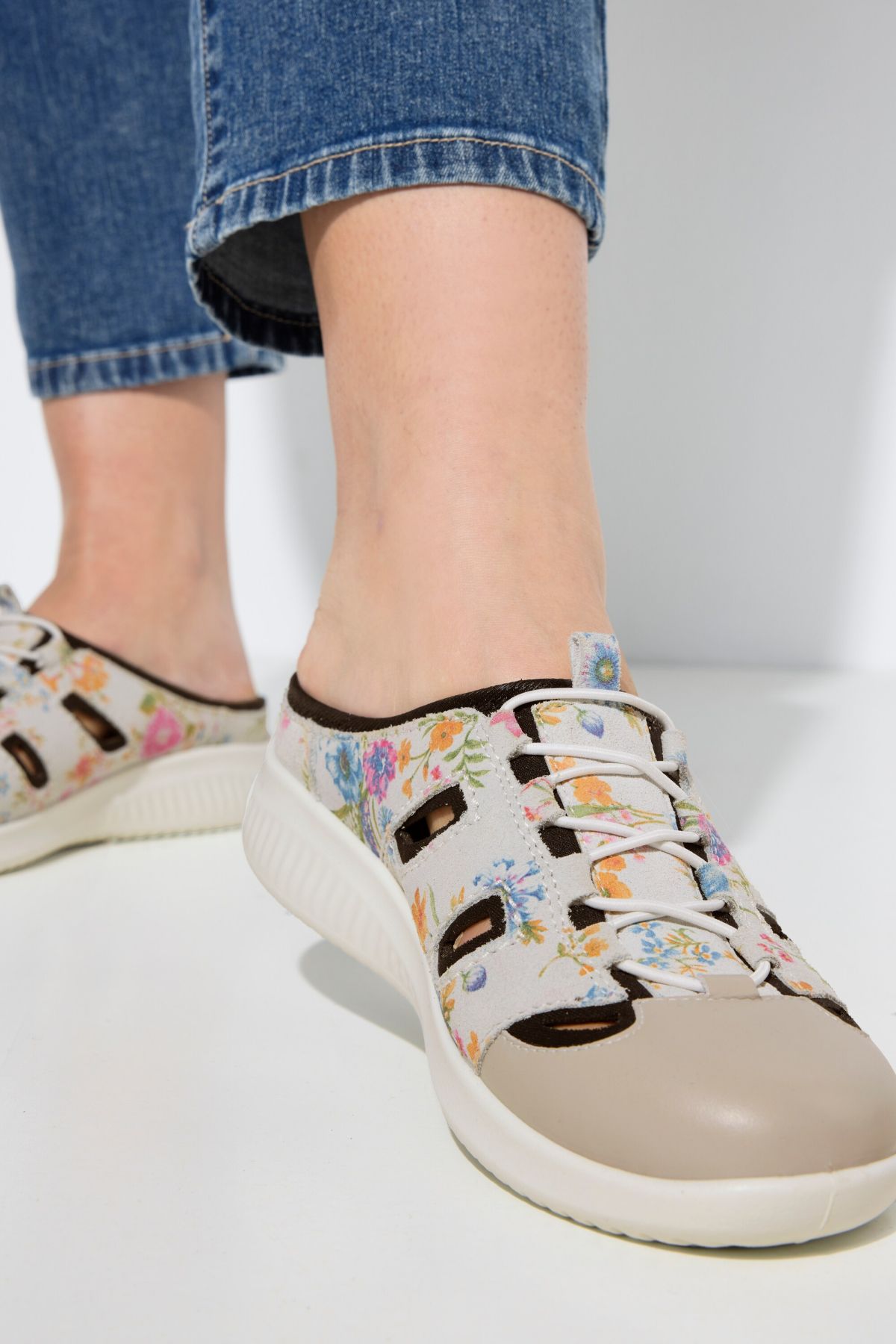 Les sabots en cuir imprimés fleurs. Effets de lacets, fentes d'aération. Confection intérieure souple avec semelle en cuir. Semelle d'usure en gomme souple, talon compensé. Largeur H. & 10;<br>