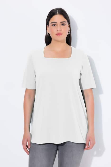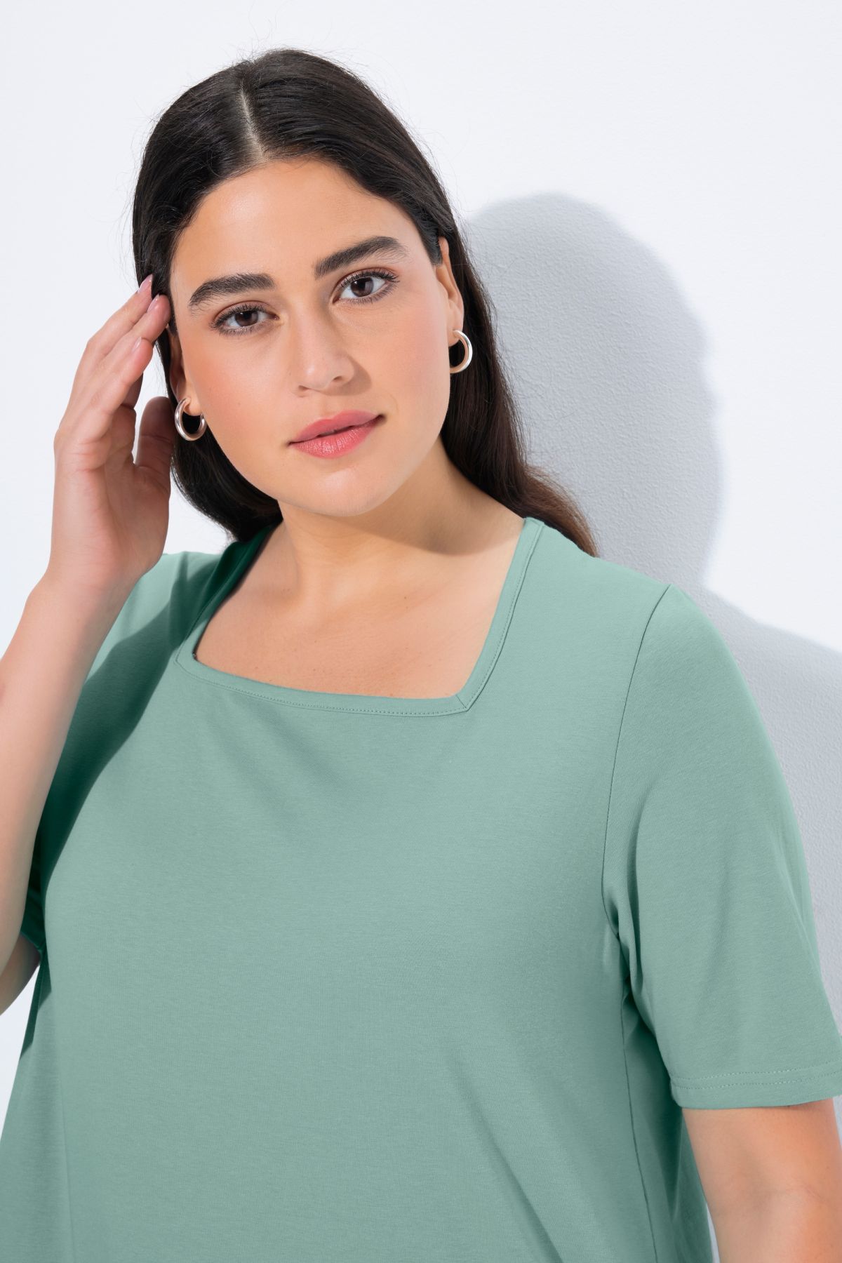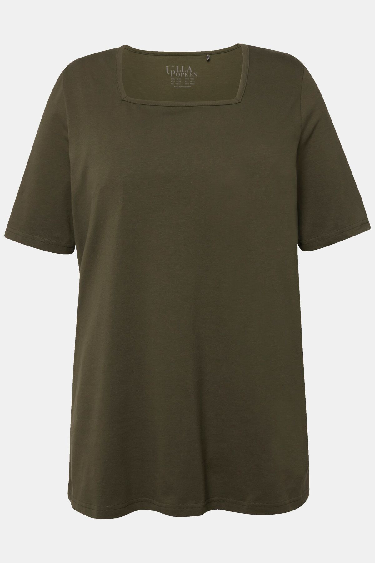 Le T-shirt Basic, ligne A, encolure carrée et manches courtes.& 10;<br>Le cœur « C’EST BIEN – CONTINUONS » indique que le vêtement est réalisé en partie ou entièrement de façon durable ou particulièrement testé aux substances nocives.& 10;<br>