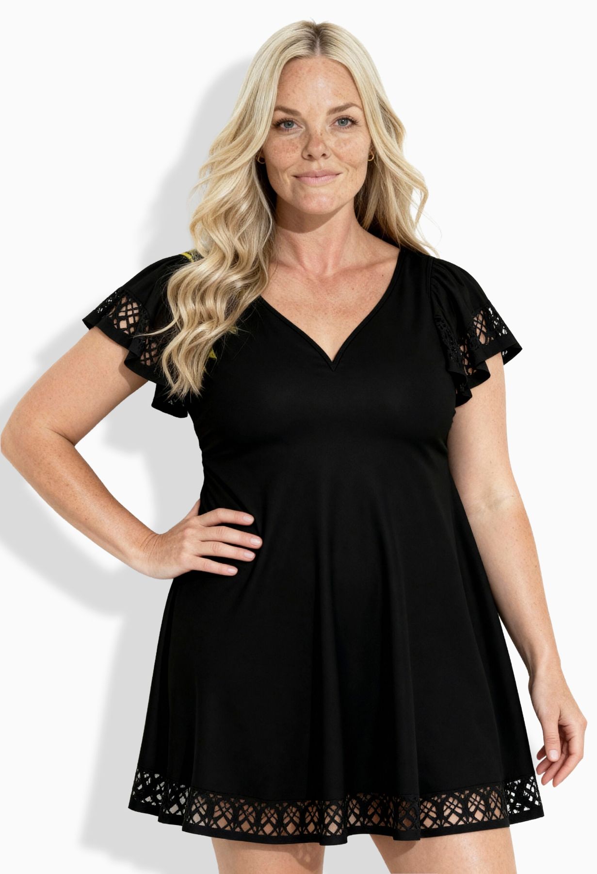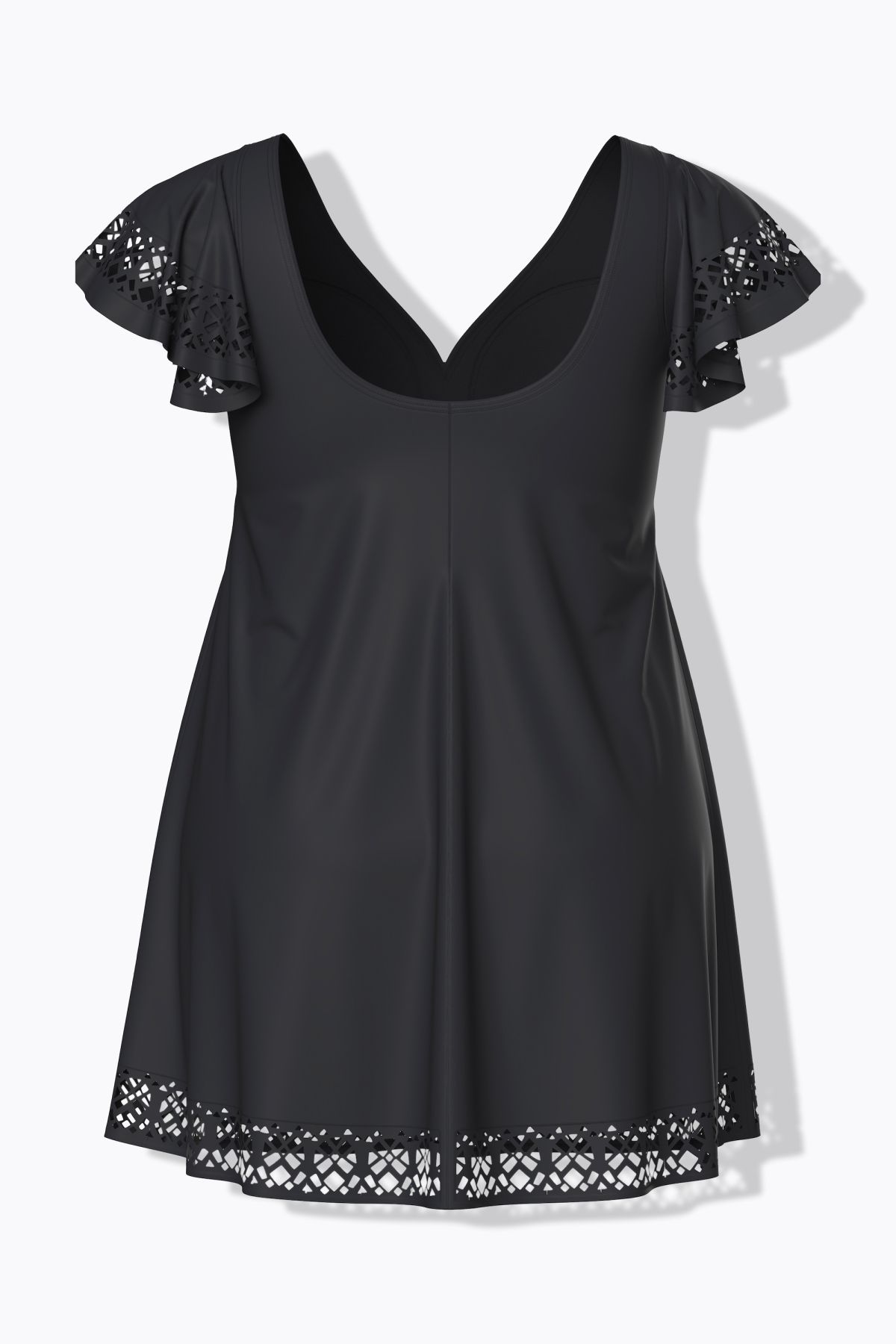 Manches courtes volantées, Motif laser à la base et aux manches, Profond décolleté en V et armatures, Corsage plissé sur les côtés, bonnets souples, Maillot de bain intégré invisible, Long. selon taille env. 59-70 cm.