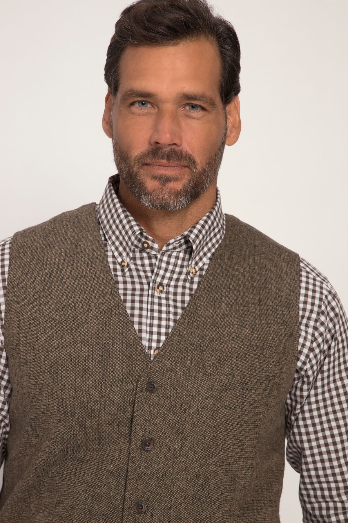 Pièce de qualité à ajouter à votre costume bavarois, Laine mélangée - tendance et agréable, Tweed tissé à motif Salt & pepper, Dos en maille pour plus de confort de mouvement, Base en pointe à l'avant, Long. entrej. env. 64-73