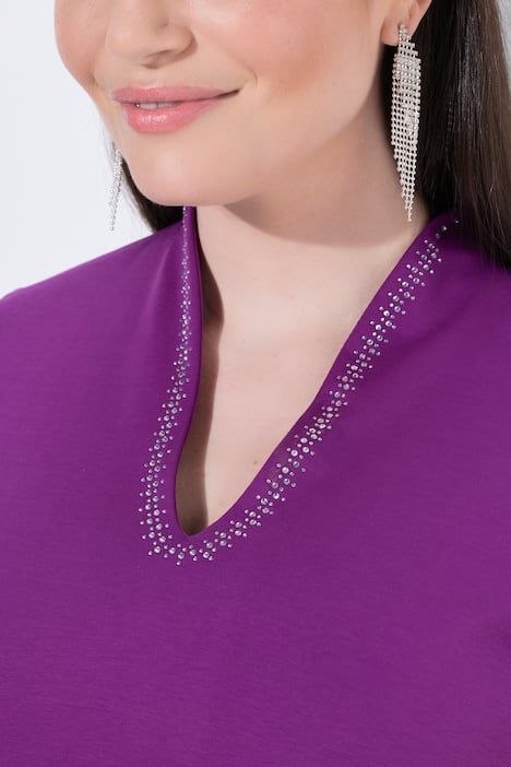 T-shirt long avec broderies, décolleté en V et manches 3/4, coupe évasée