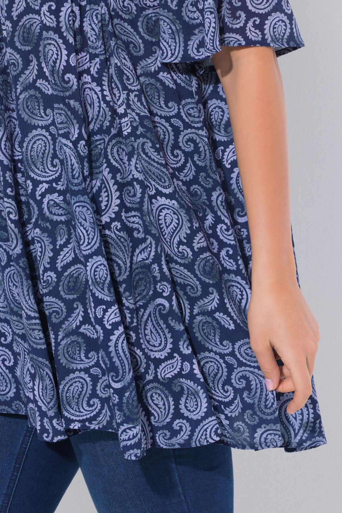 Tissu crêpe doux et confortable, motif animaux de la jungle tendance, Décolleté carré, Coupe fortement évasée, couture arrondie sur le devant et plis godets, Manches courtes et amples, Viscose douce et fluide, Long. selon taille env. 81-85 cm.