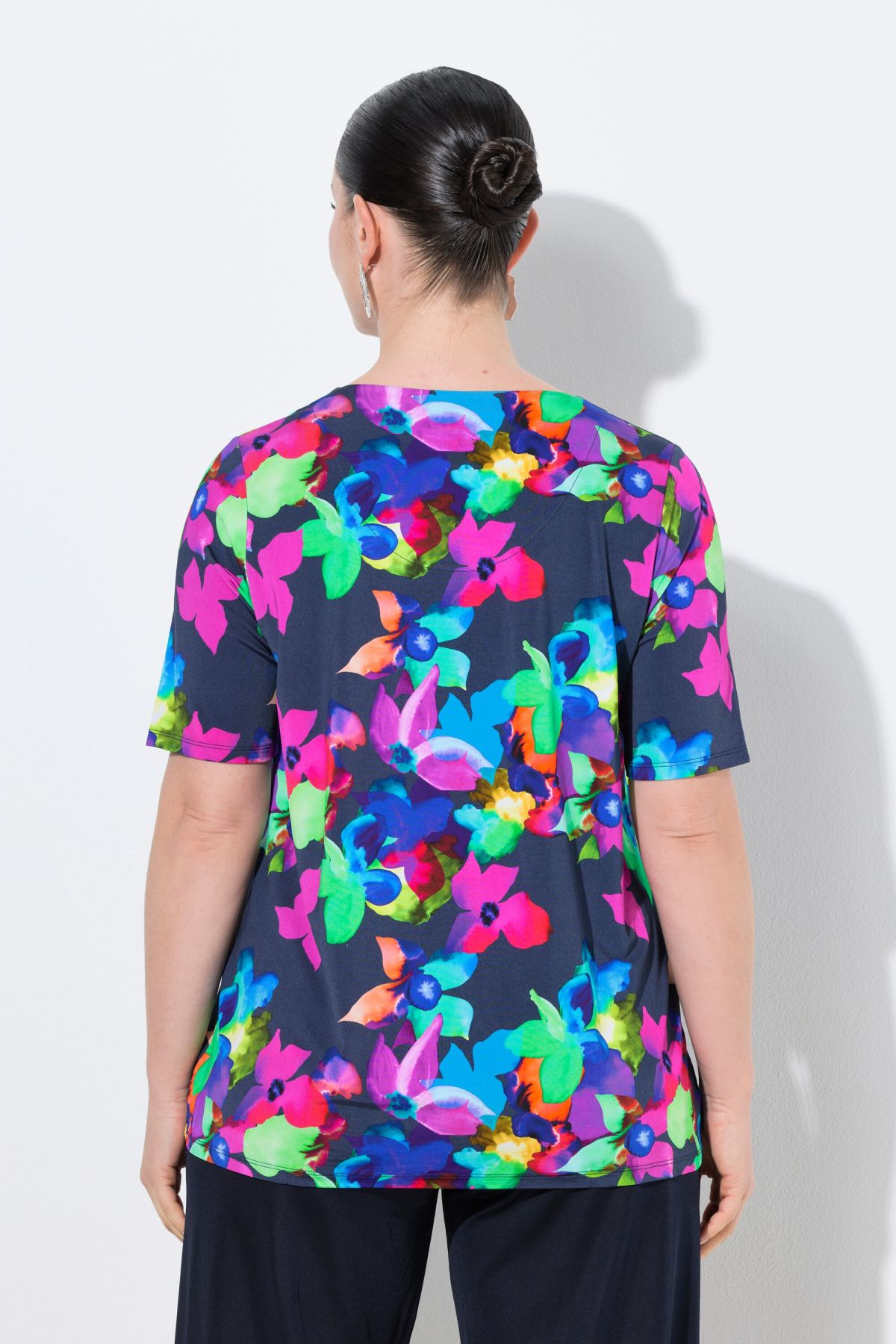 Imprimé floral coloré, Col rond, Coupe évasée confortable, Manches courtes, Tissu doux et raffiné, au tombé fluide, Long. selon taille env. 68-76 cm.