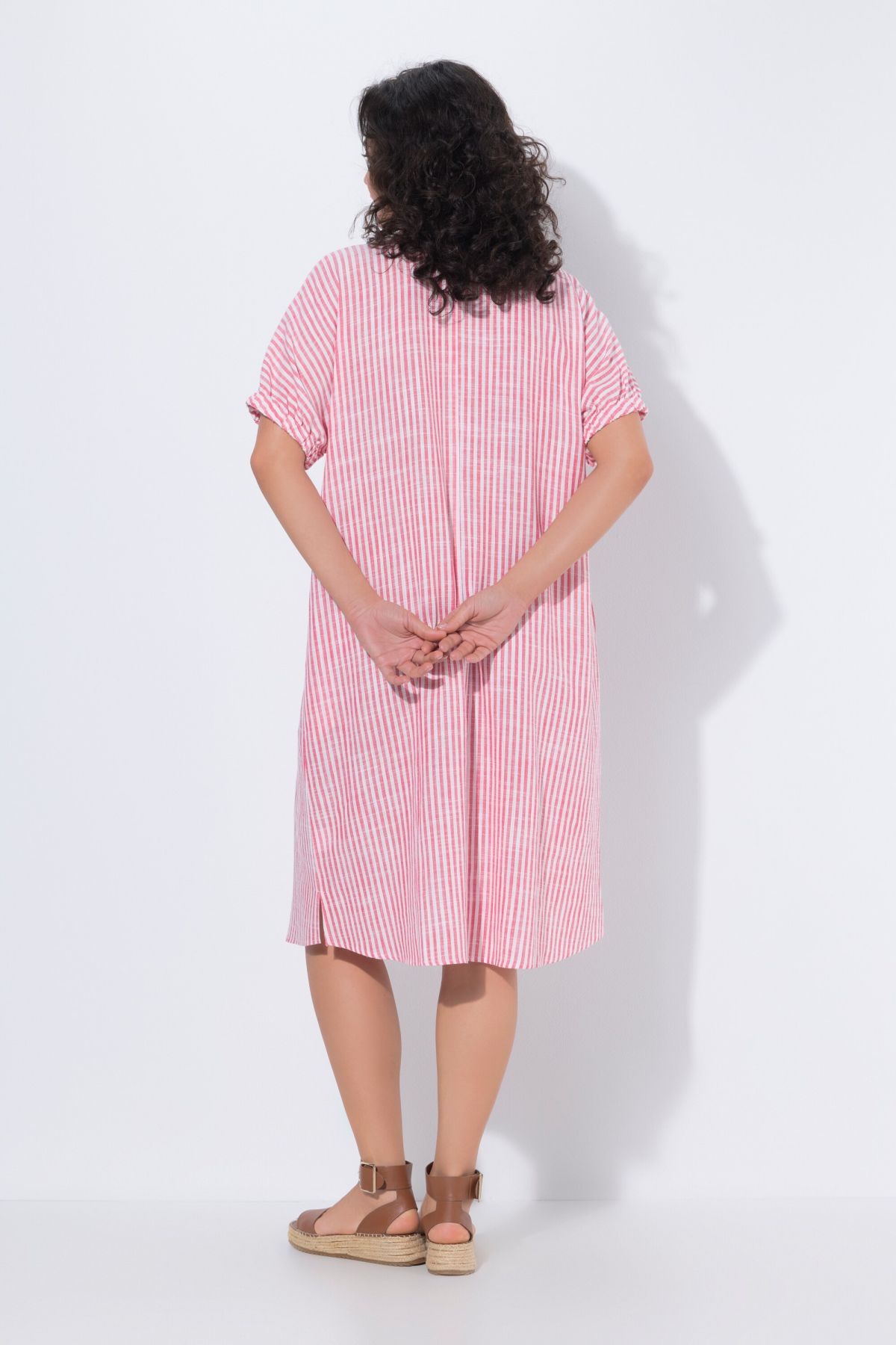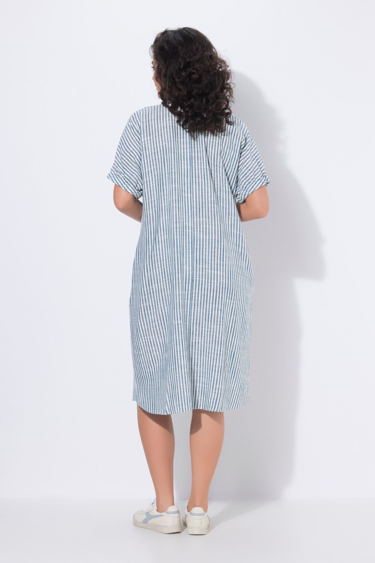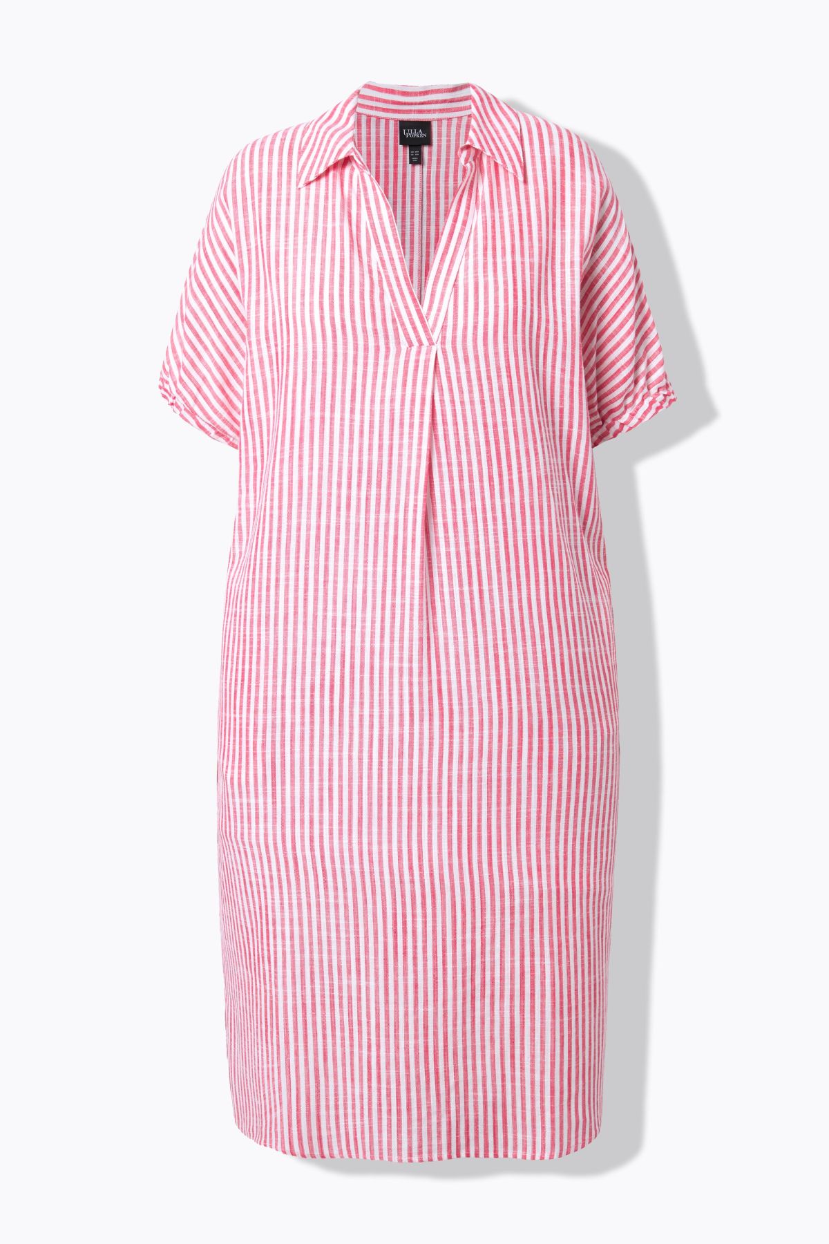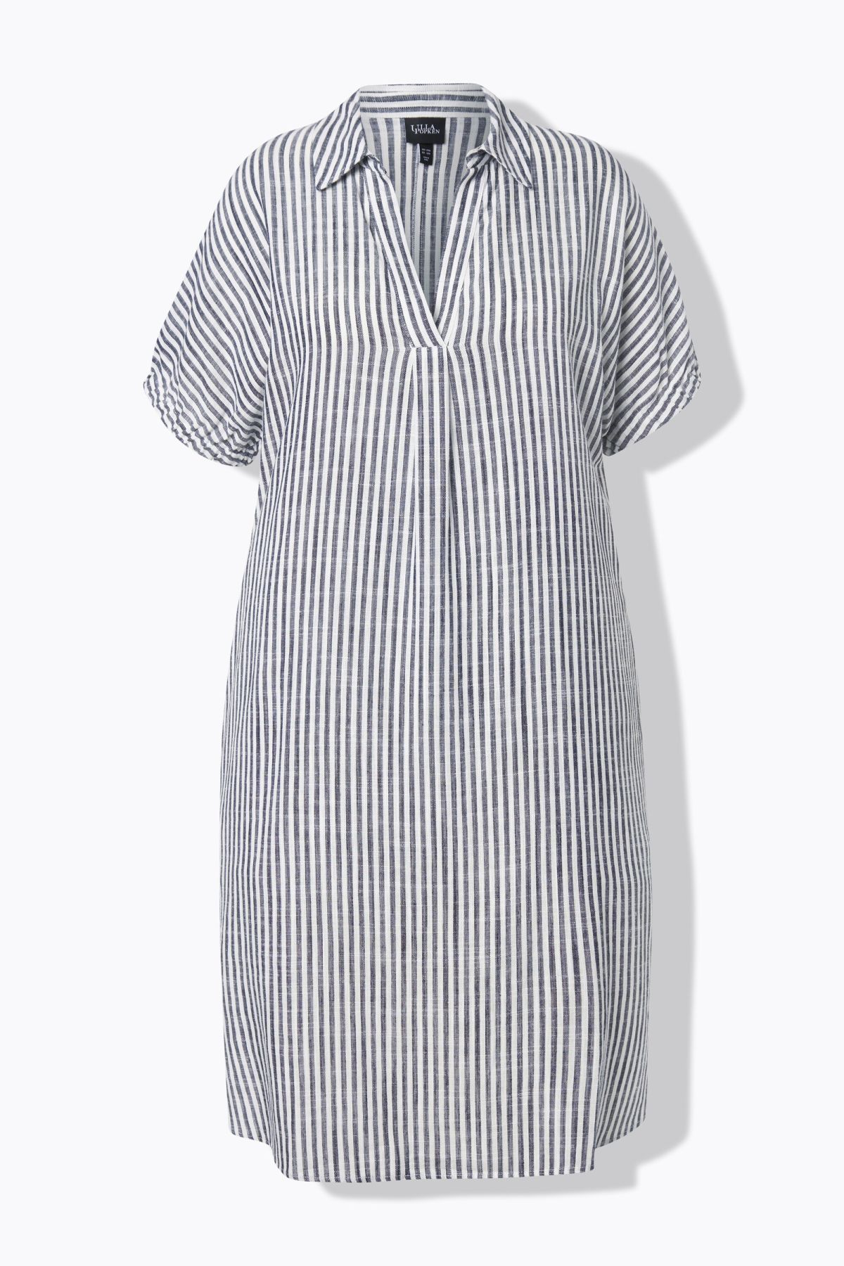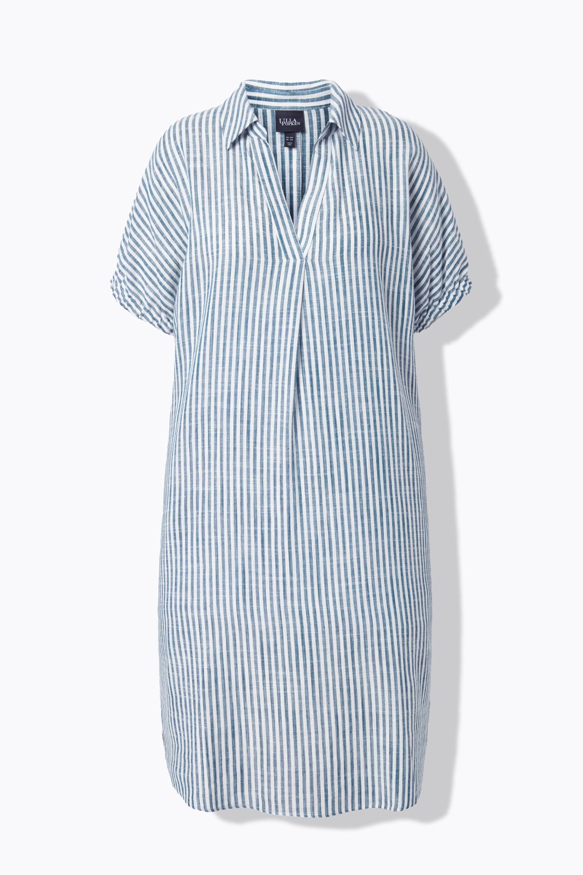 Motif à rayures tendance, Col chemise à encolure en V, Coupe oversize décontractée, base arrondie et fentes sur les côtés, Manches courtes à finition élastique, Mélange lin-viscose de grande qualité, Long. selon taille env. 107-111 cm.
