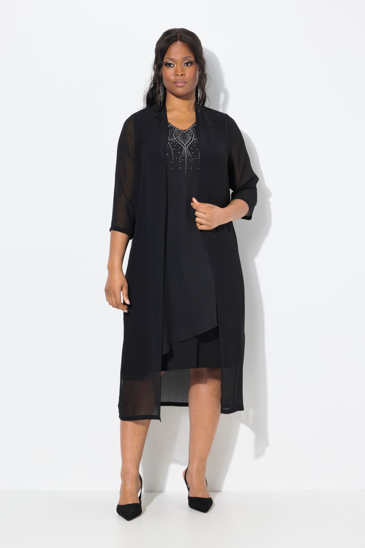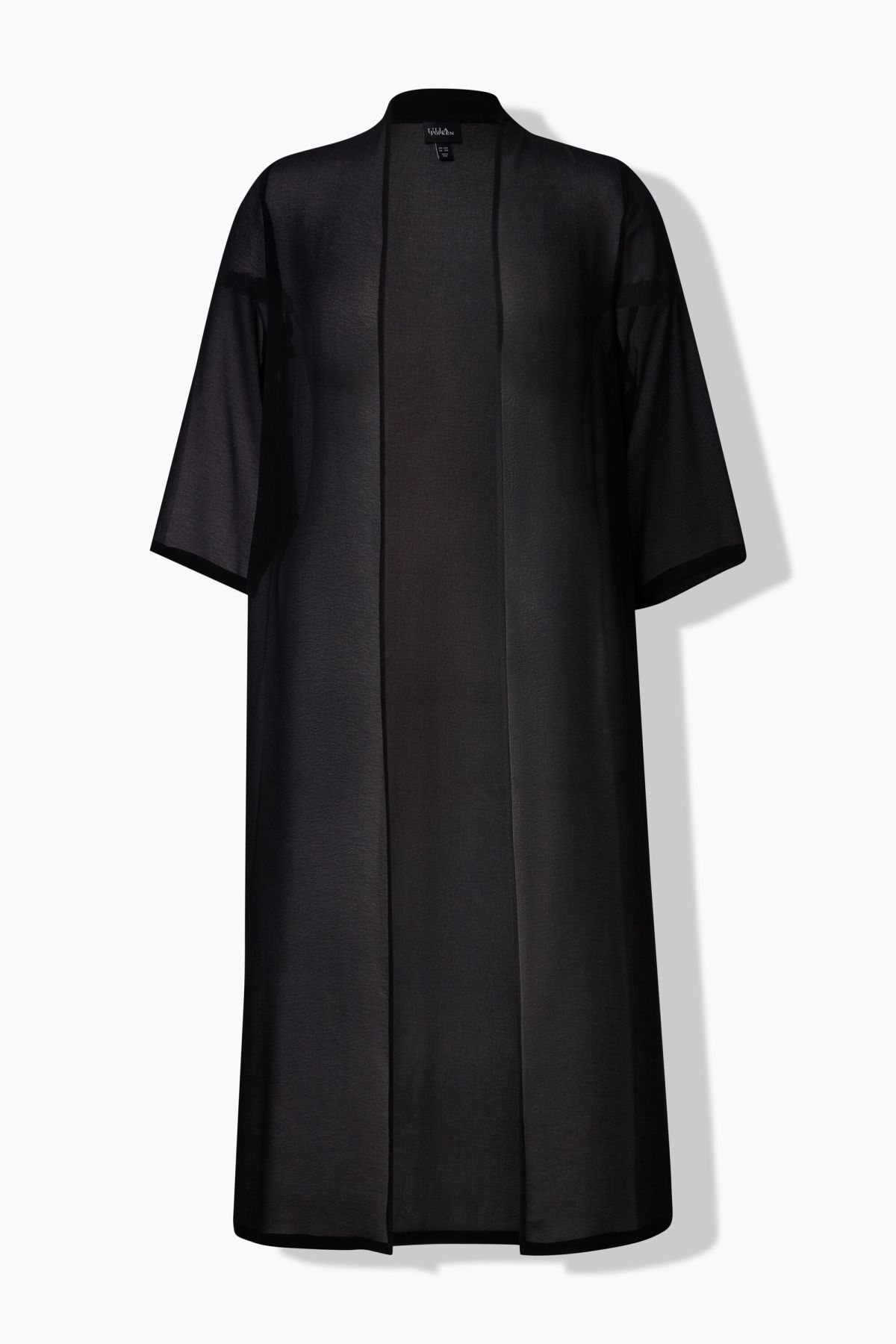 Mousseline légèrement transparente, Élégant col châle, Longue veste ouverte, sans fermeture, Tissu agréablement léger, Manches 3/4, Long. env. 120 cm.