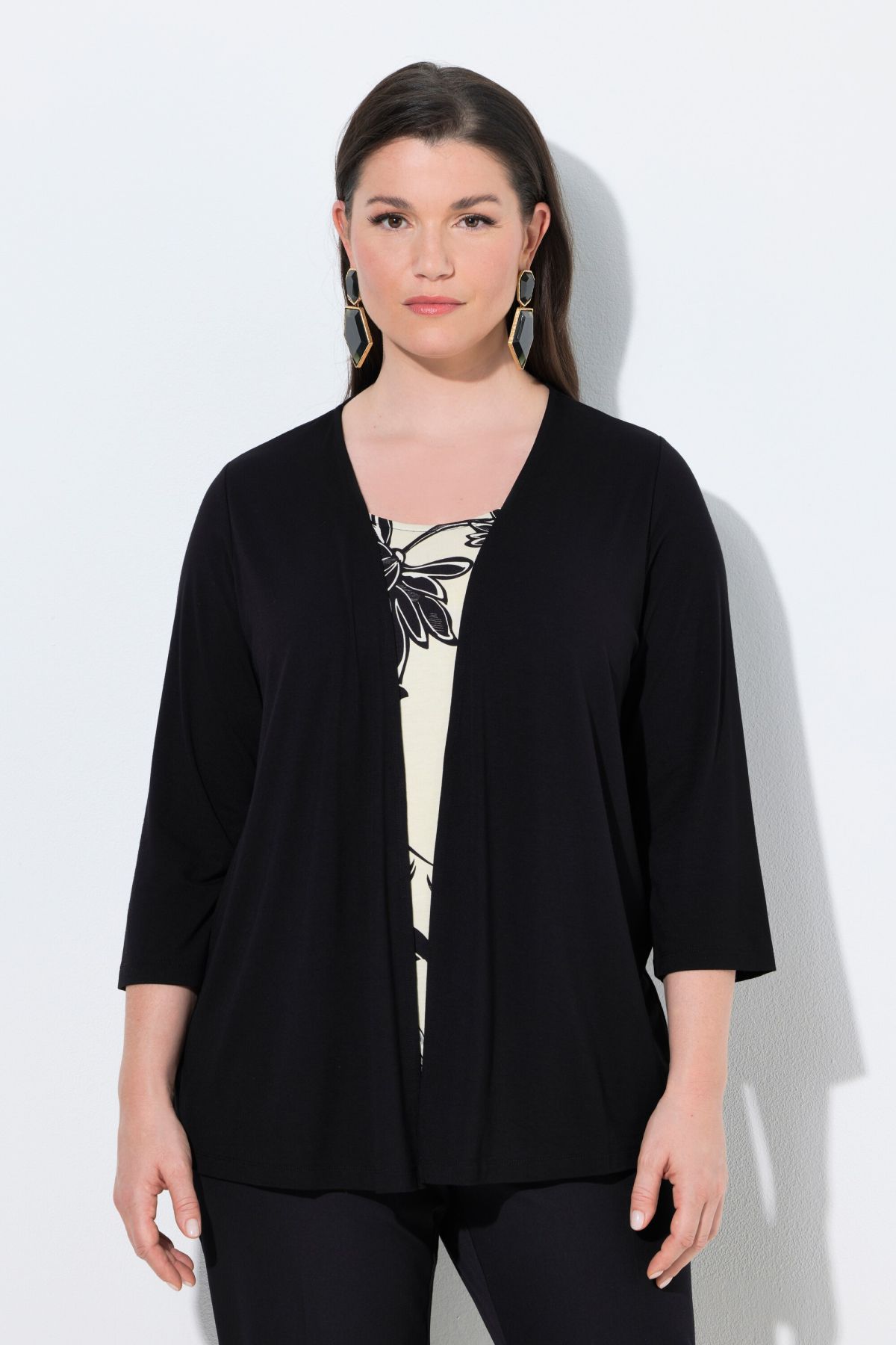 Superbe motif floral, Décolleté rond, Coupe classique avec « veste » superposée, Manches 3/4, Viscose douce et confortable, avec élasthanne, Long. selon taille env. 68-76 cm.