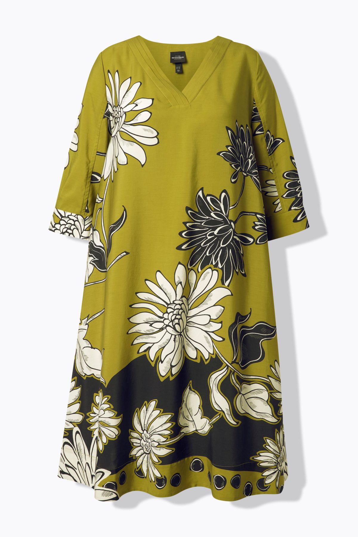 Motif grandes fleurs, Décolleté en V se terminant par des plis fantaisie, Coupe évasée, base ample et confortable, Poches latérales réservées dans la couture, Lyocell naturellement doux et confortable, Long. env. 110-114 cm.