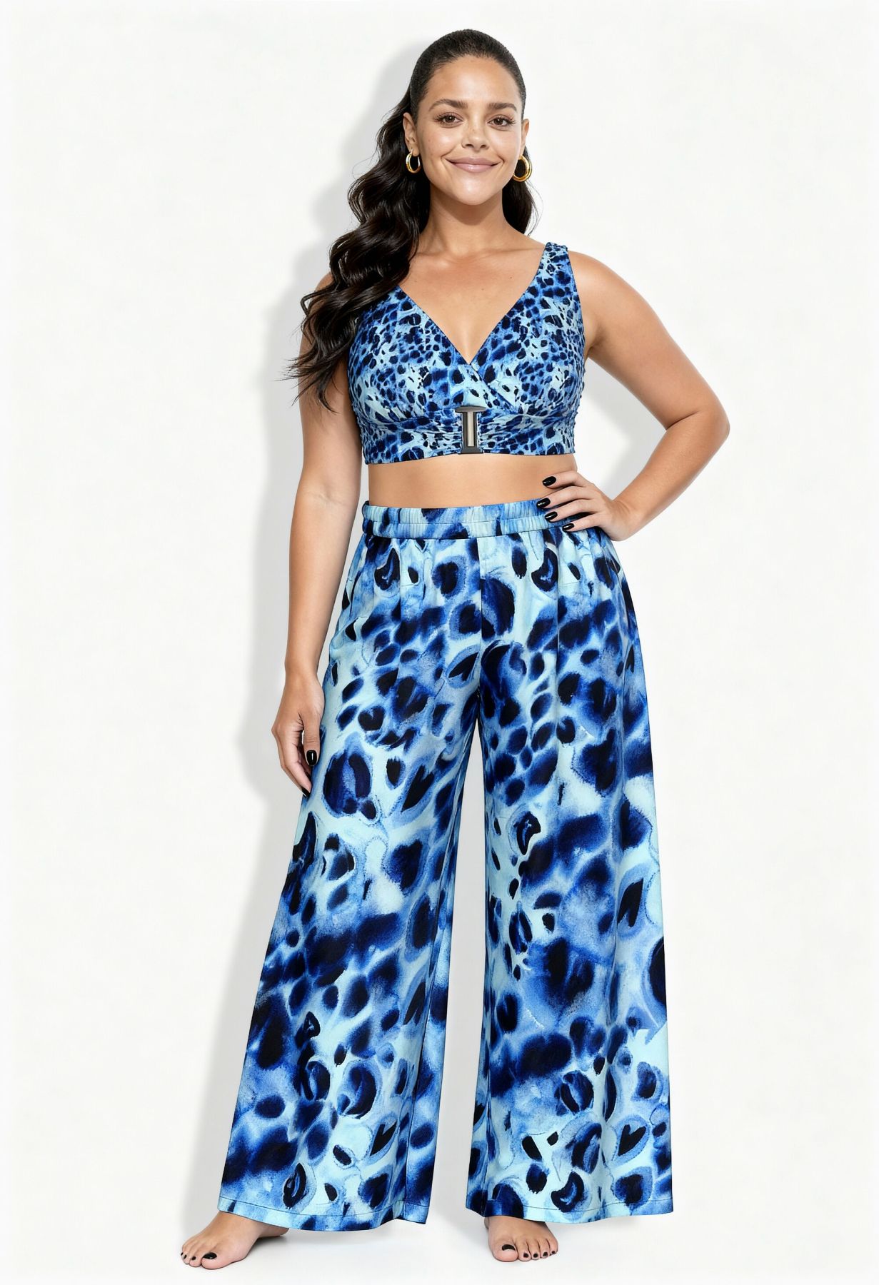 Motif animal tendance, Jambe droite et large, Taille élastique confortable, Poches fendues sur les côtés, Viscose douce et confortable, au tombé fluide, Entrej. env. 78 cm.