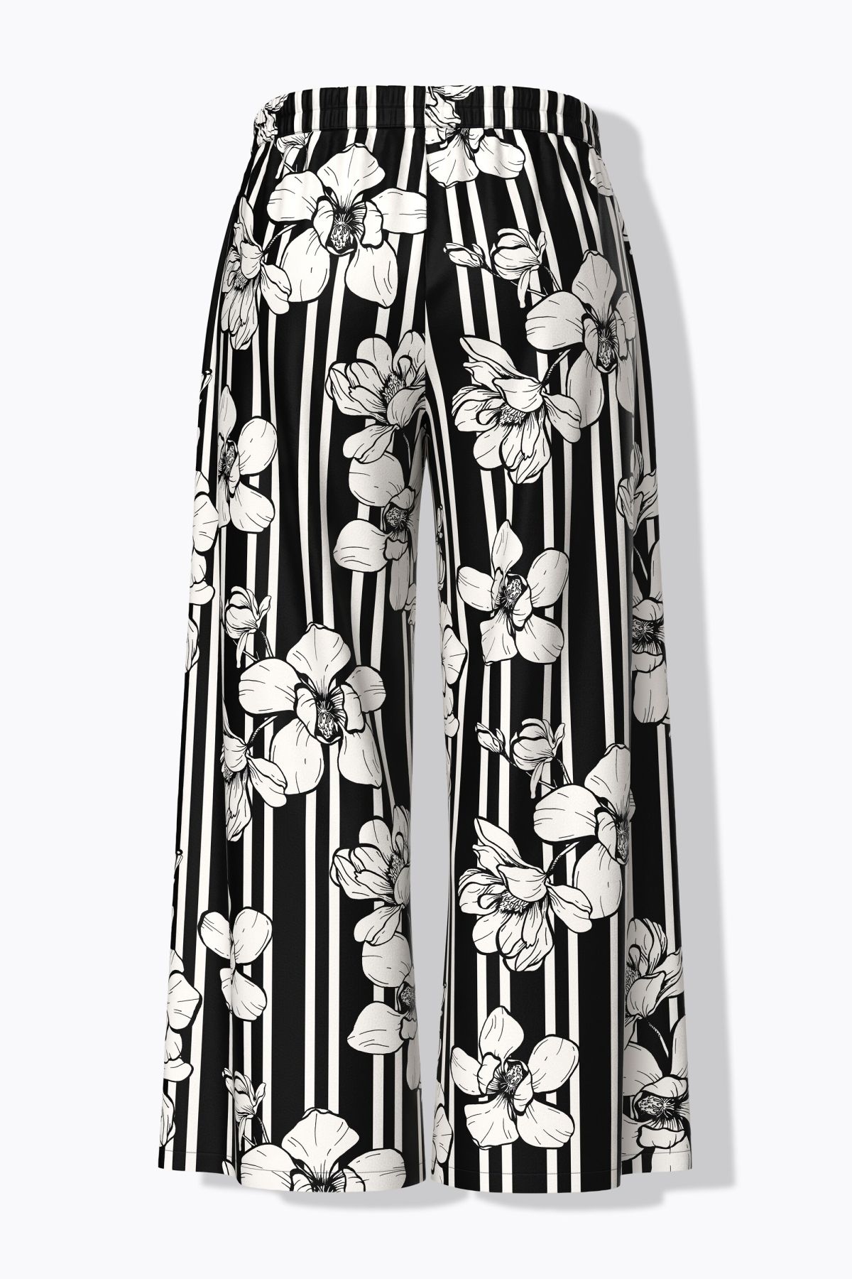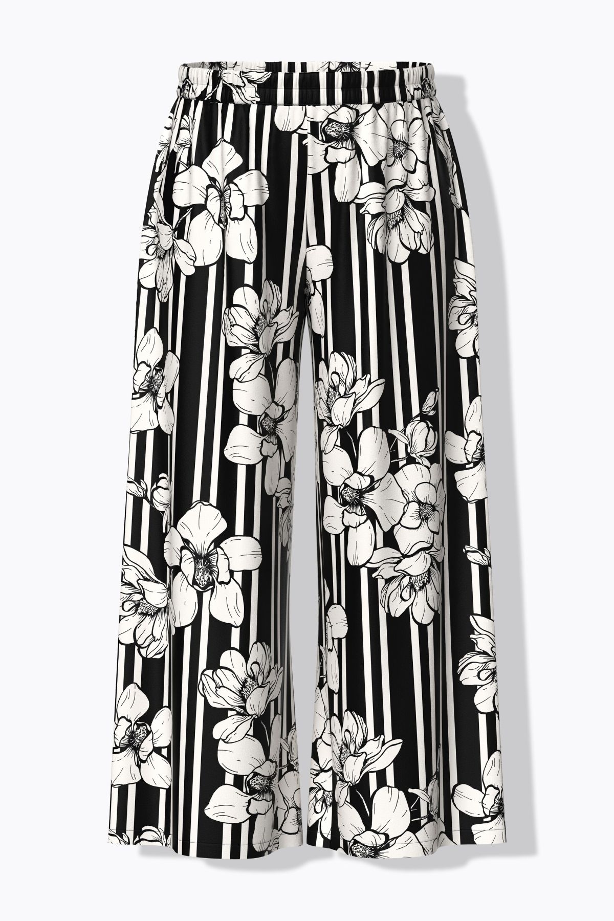 Motif noir & blanc, mélangeant fleurs et rayures, Jambe droite et large, Taille élastique confortable, Poches fendues sur les côtés, Viscose douce et confortable, au tombé fluide, Entrej. env. 78 cm.