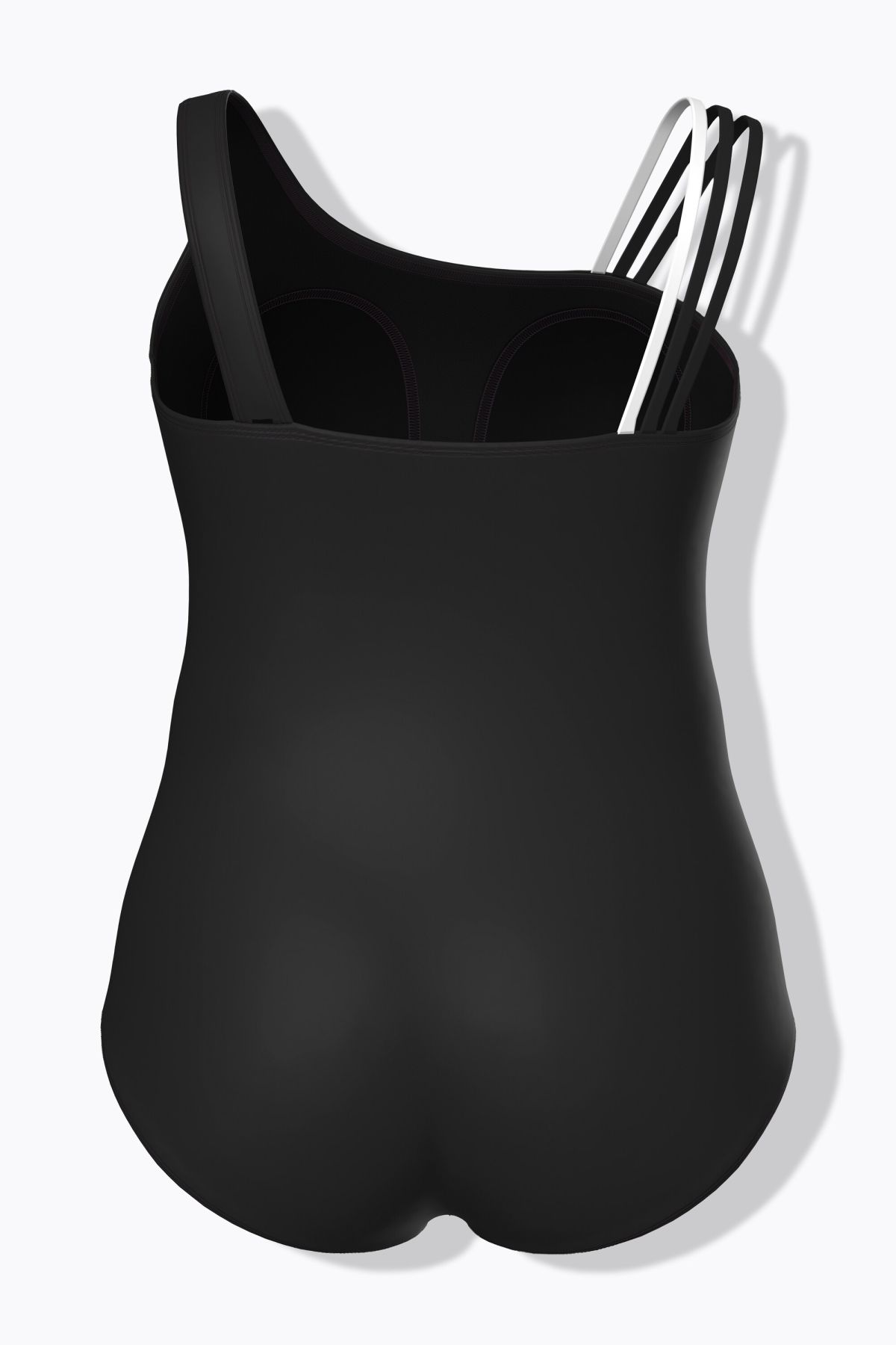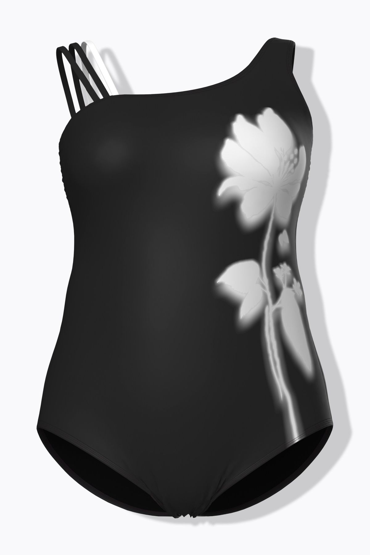 Elégant motif floral noir & blanc, Bonnets souples et bande de soutien sous la poitrine, Bretelle triple sur l'épaule droite, Doublure poitrine douce et confortable, Contient du polyamide recyclé, plus respectueux de l'environnement