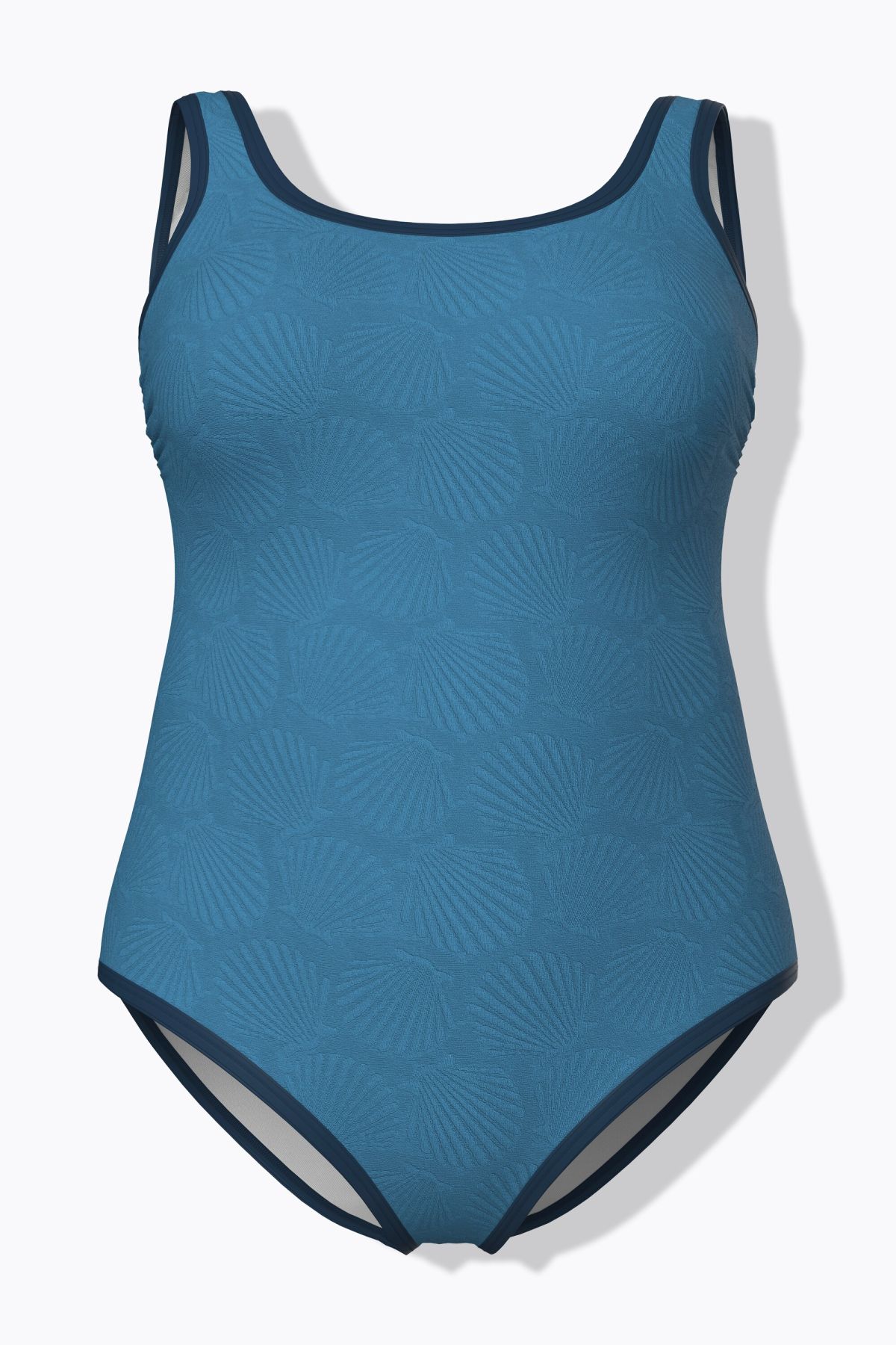 Motif coquillages discret et passepoils colorés, Décolleté rond, Dos nageur sportif, sans bonnets souples, Bande de soutien sous la poitrine