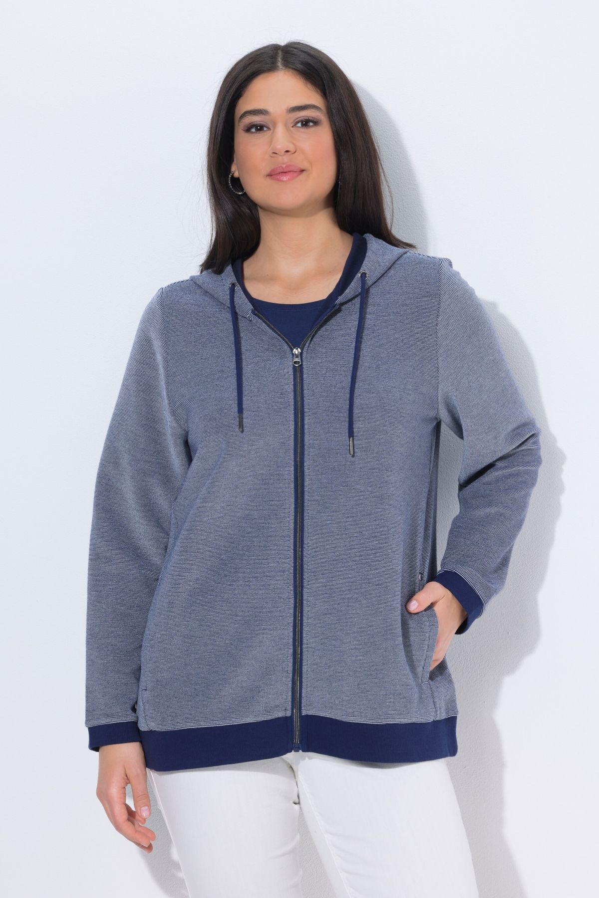 Jersey texturé bicolore, Capuche avec cordon coulissant sous tunnel, Coutures en biais sur les côtés, avec poches, Finitions bords-côtes aux extrémités des manches et à la base, Molleton doux et confortable, Long. selon taille env. 68-76 cm.