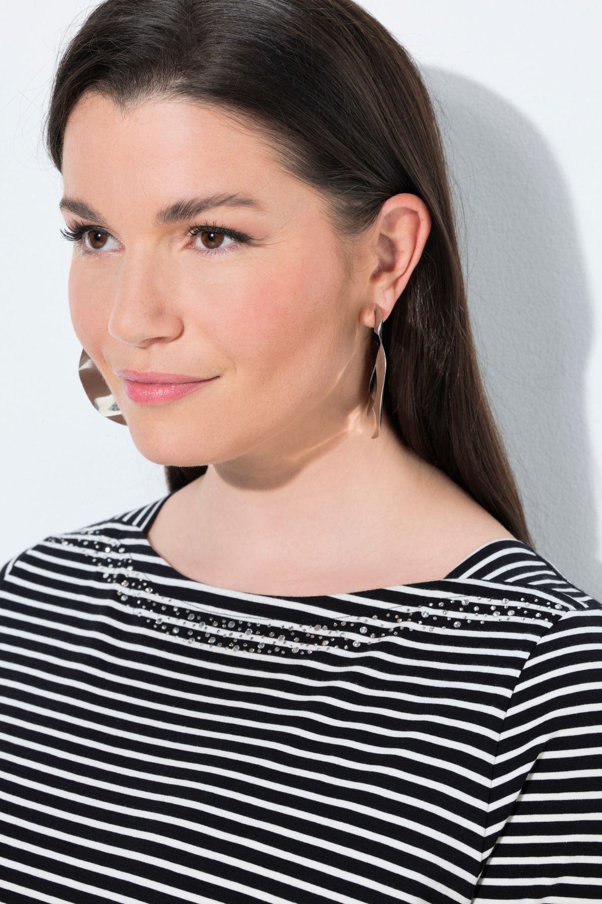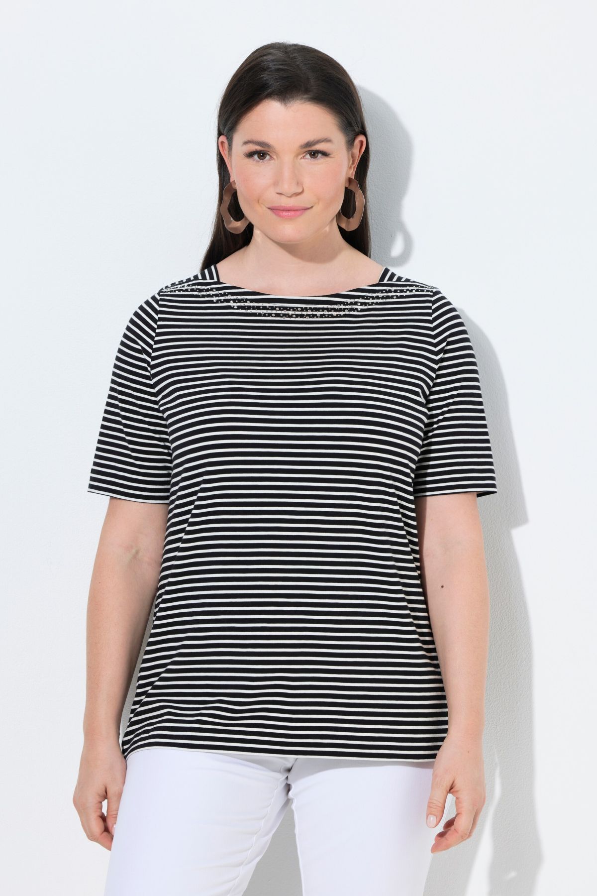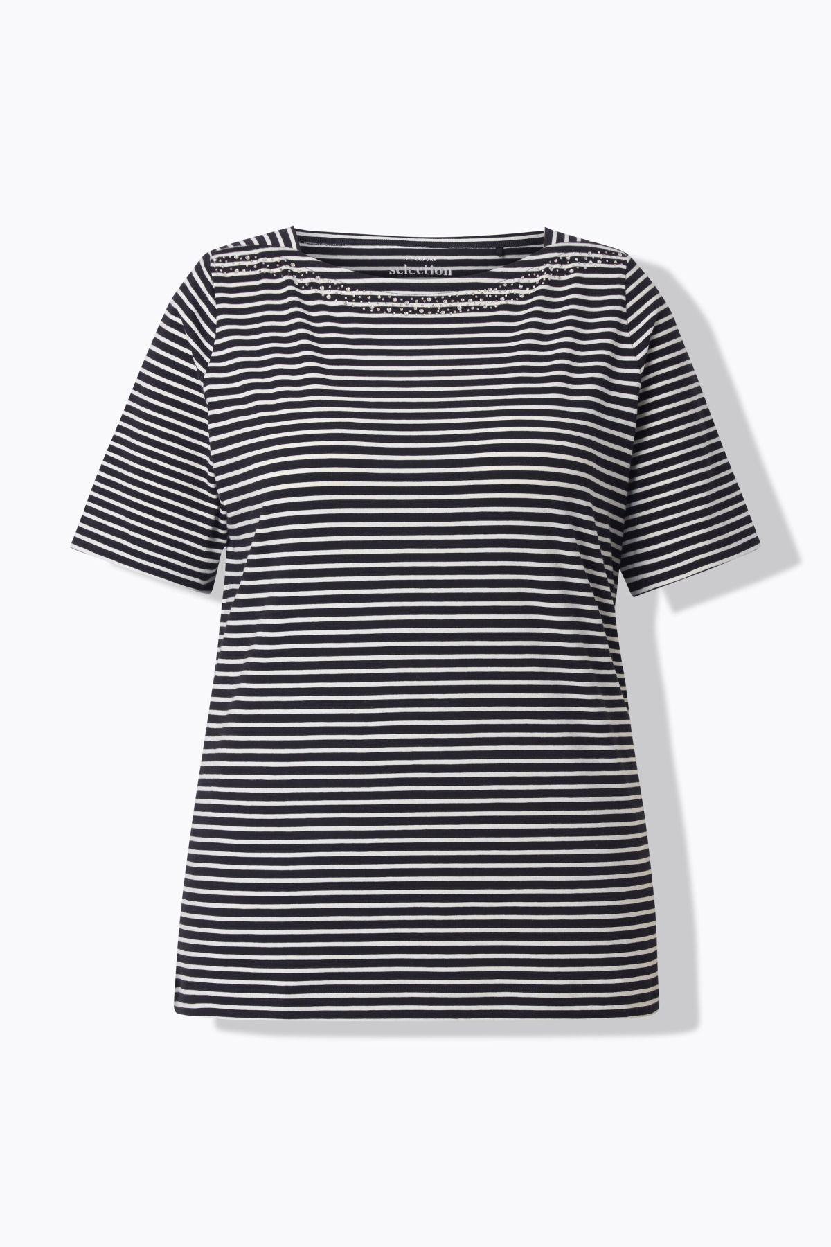 Élégant motif à rayures, Encolure bateau, avec empiècements en forme de triangle sur les côtés, Coupe Classic Fit, Manches courtes descendant un peu plus bas que la normale, Coton Pima de grande qualité, avec teneur en élasthanne, Long. selon taille env.