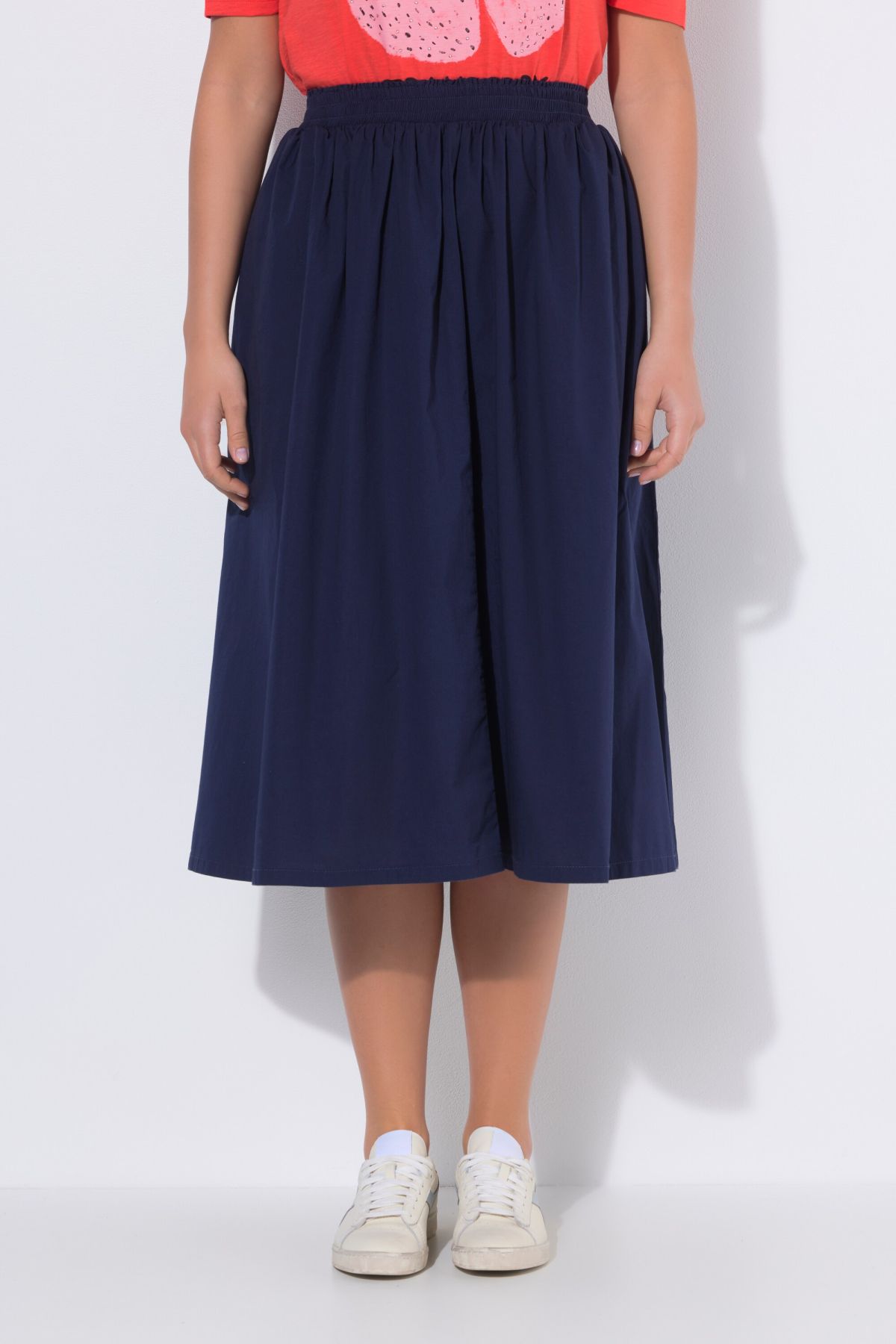 Matière extensible, extrêmement confortable, Taille élastique confortable, Coupe évasée, Poches fendues sur les côtés, Coton naturel enrichi en élasthanne, Long. env. 75 cm.