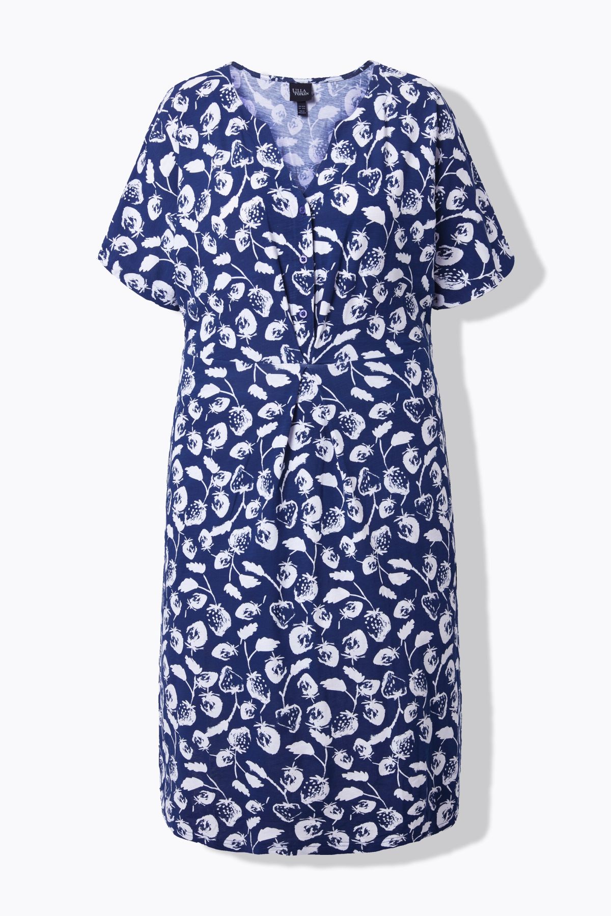Jersey flammé élégamment texturé, motif fraises, Col tunisien avec patte de boutonnage descendant jusqu'à la couture horizontale, Coupe évasée confortable avec plis fantaisie et plis godet, Manches courtes, Coton naturel enrichi en élasthanne, Long. selon
