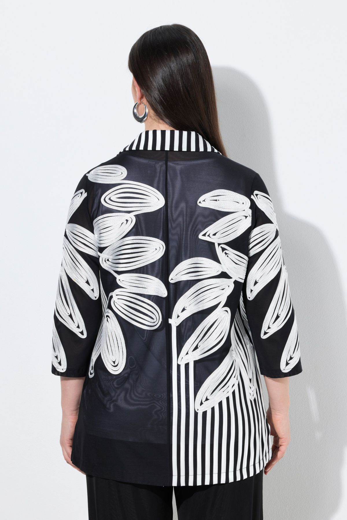 Bandes fantaisie brodées, Modèle classique avec col chemise et patte de boutonnage, Coupe évasée, plus longue que la normale, avec fentes sur les côtés, Manches 3/4 amples, Tulle légèrement transparent, Long. selon taille env. 76-80 cm.