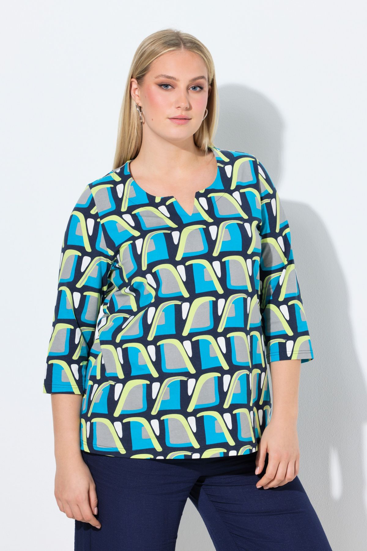 Motif graphique, Col tunisien très féminin, Coupe évasée, base ample et confortable, Manches 3/4, Coton naturel enrichi en élasthanne, Long. selon taille env. 68-76 cm.