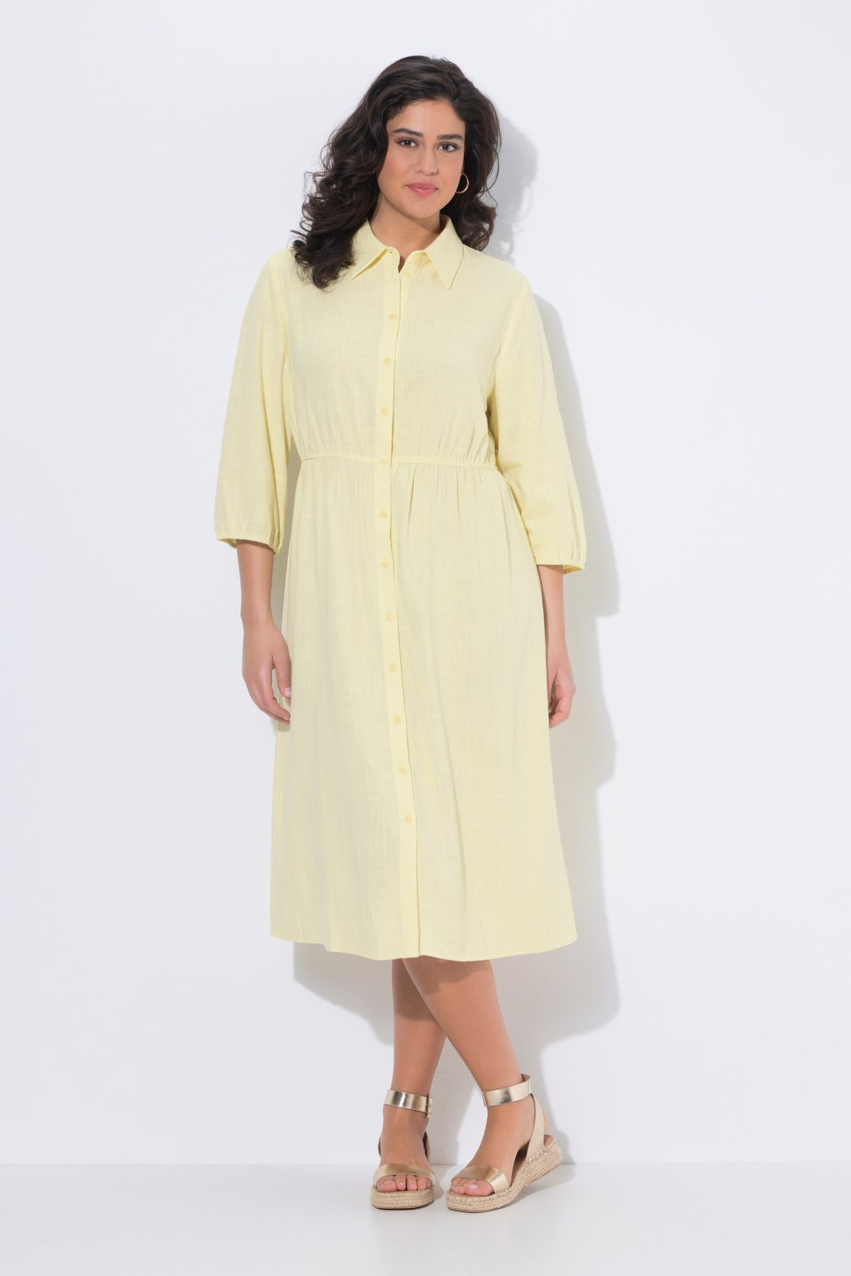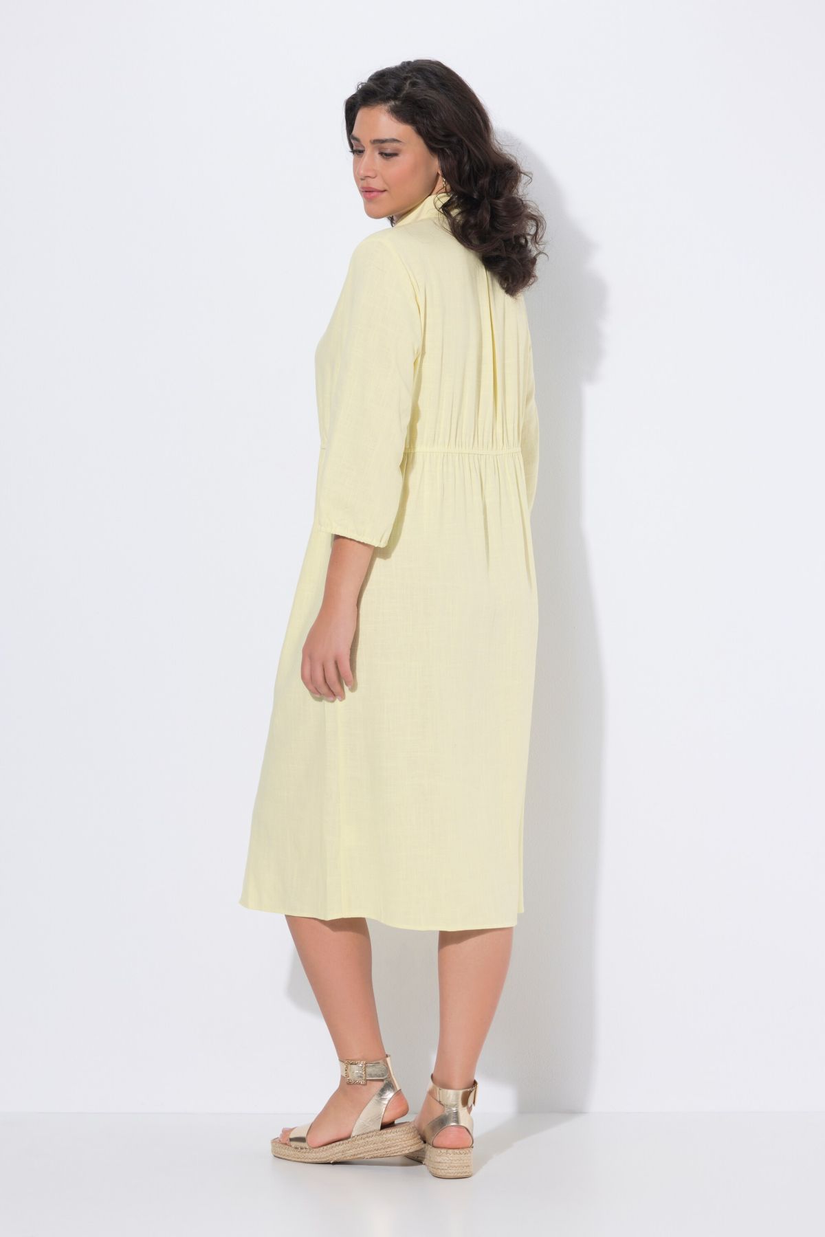 Modèle de grande qualité, en lin mélangé, Col chemise, Coupe évasée, couture horizontale élastique au niveau de la taille, Patte de boutonnage sur toute la longueur, Manches 3/4 avec finition élastique, Long. env. 114 cm.