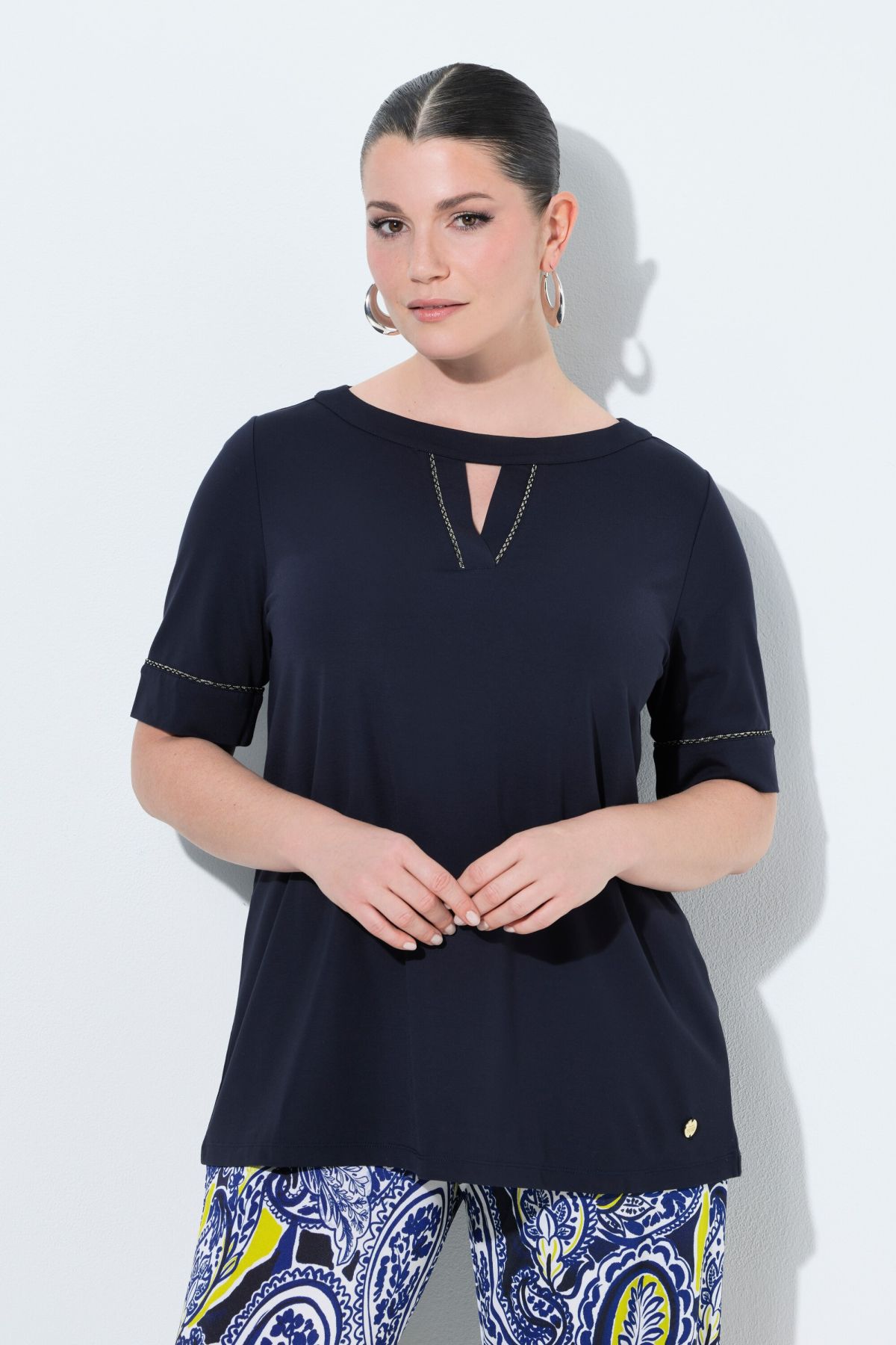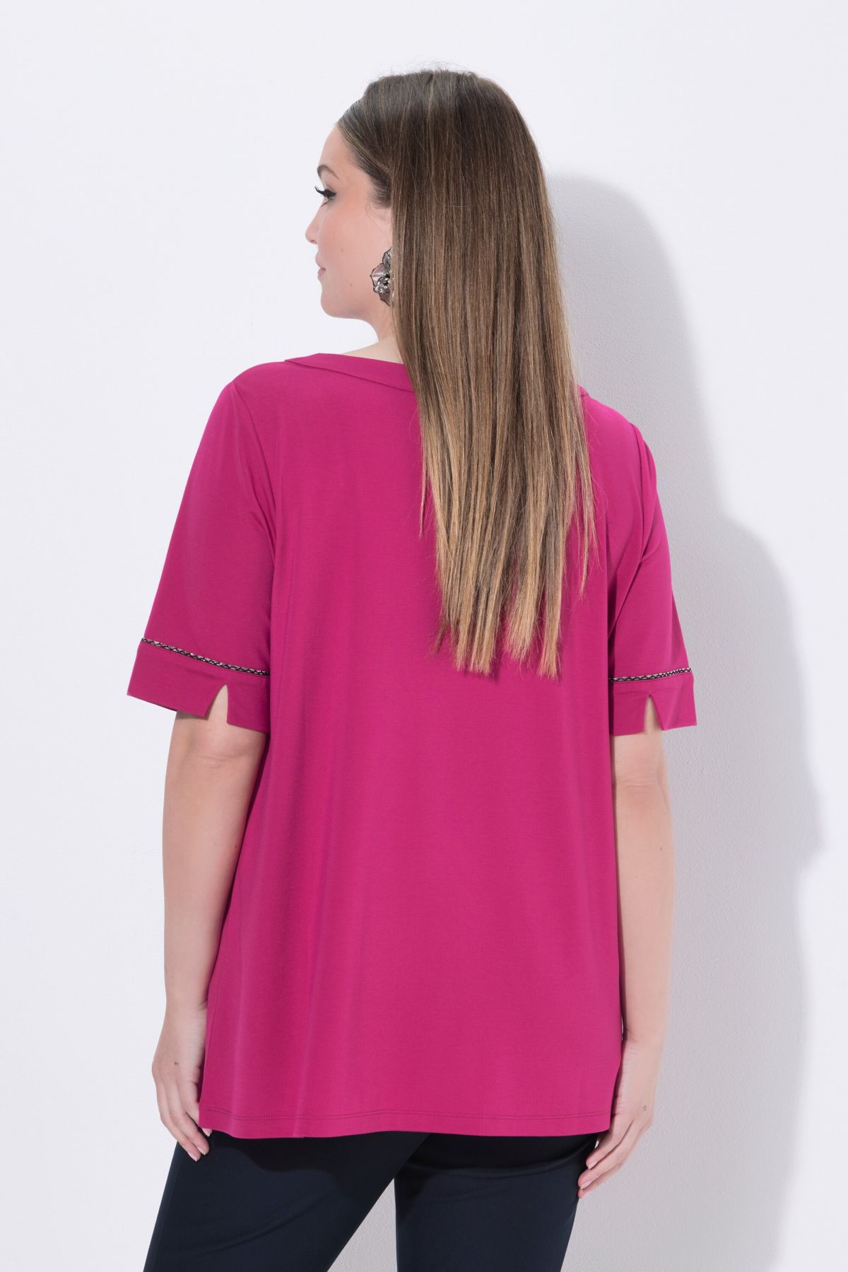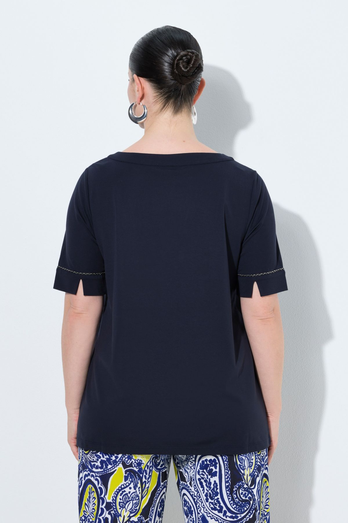 Élégant liseré fantaisie au niveau du décolleté et sur les manches, Encolure bateau, Coupe légèrement évasée, Manches courtes, Jersey point de Rome de grande qualité, Long. selon taille env. 68-76 cm.