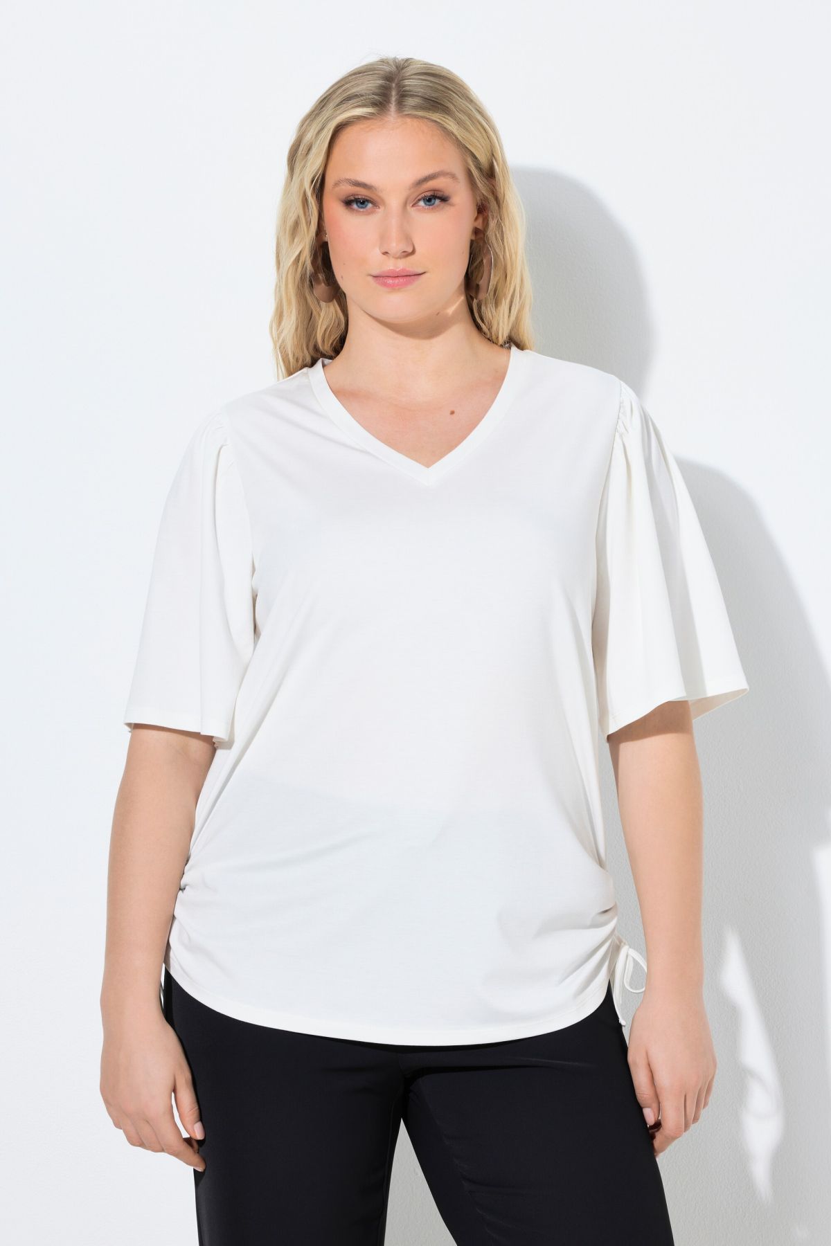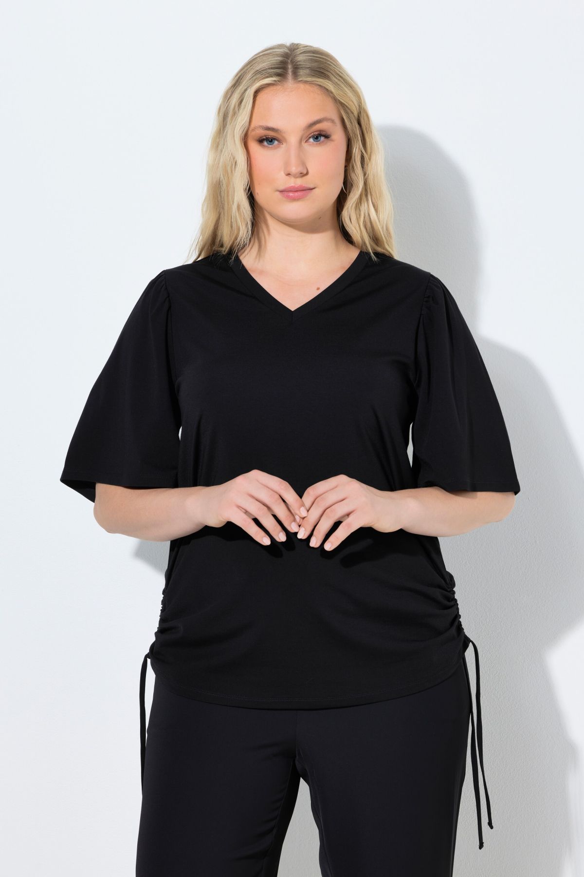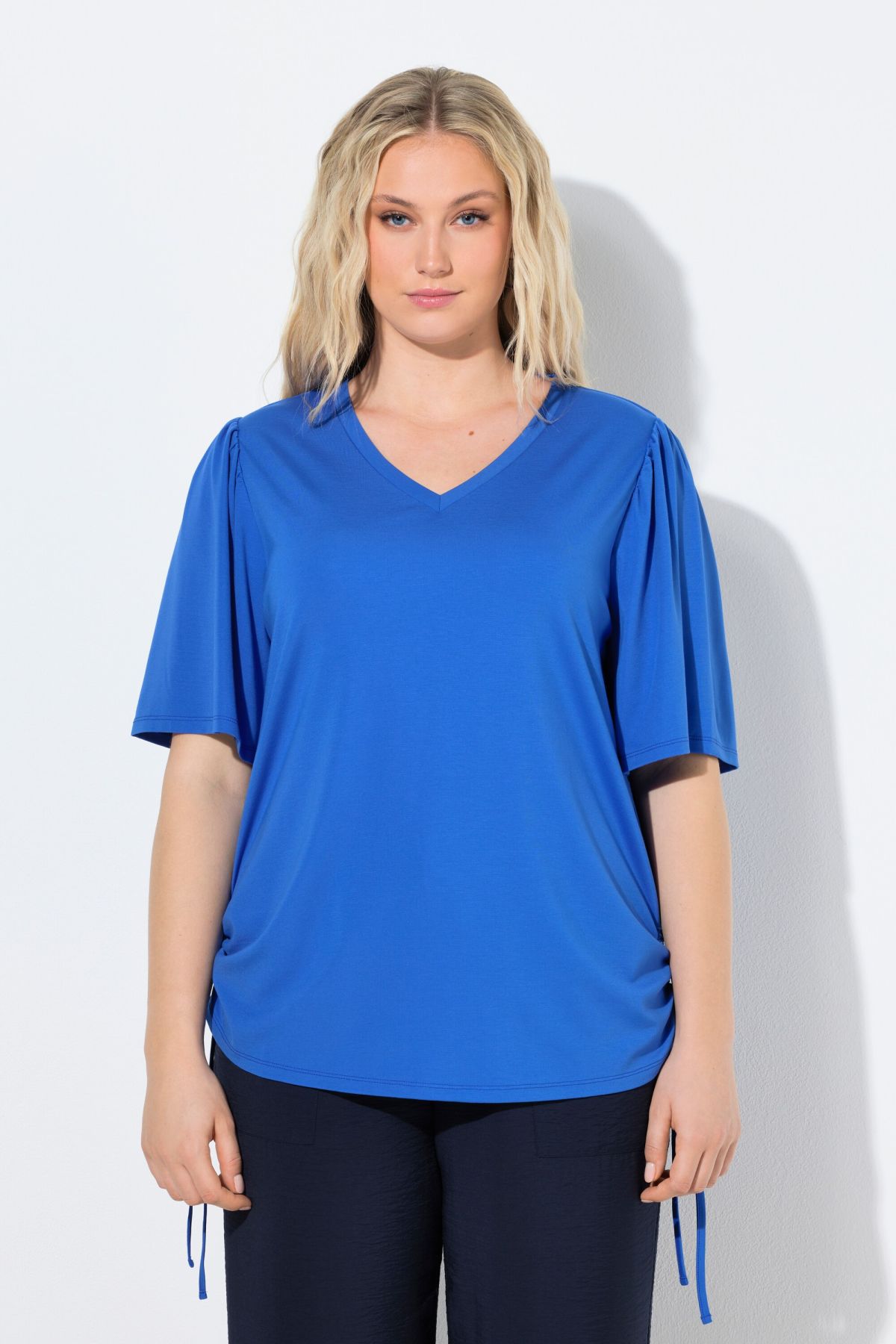 Petit cordon à froncer sur les côtés, Décolleté en V, Coupe Classic Fit, Manches papillon courtes et amples, Viscose mélangée douce et confortable, Long. selon taille env. 68-76 cm.