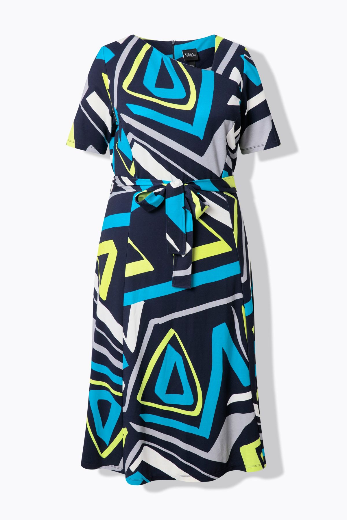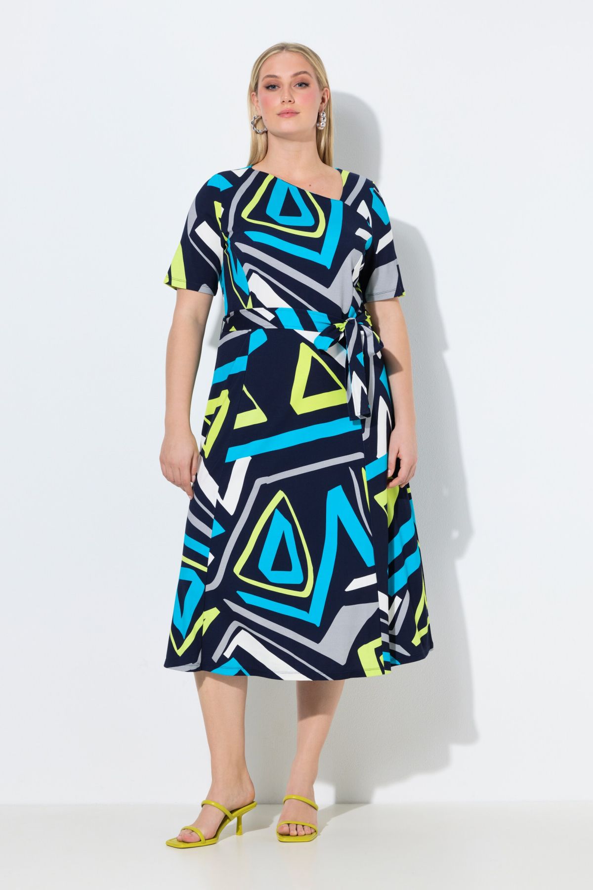 Imprimé graphique tendance, Décolleté en V asymétrique, Coupe évasée, base ample et confortable, coutures viennoises, Ceinture à nouer à la taille, sous tunnel, Jersey de viscose agréablement élastique, Long. env. 120 cm.