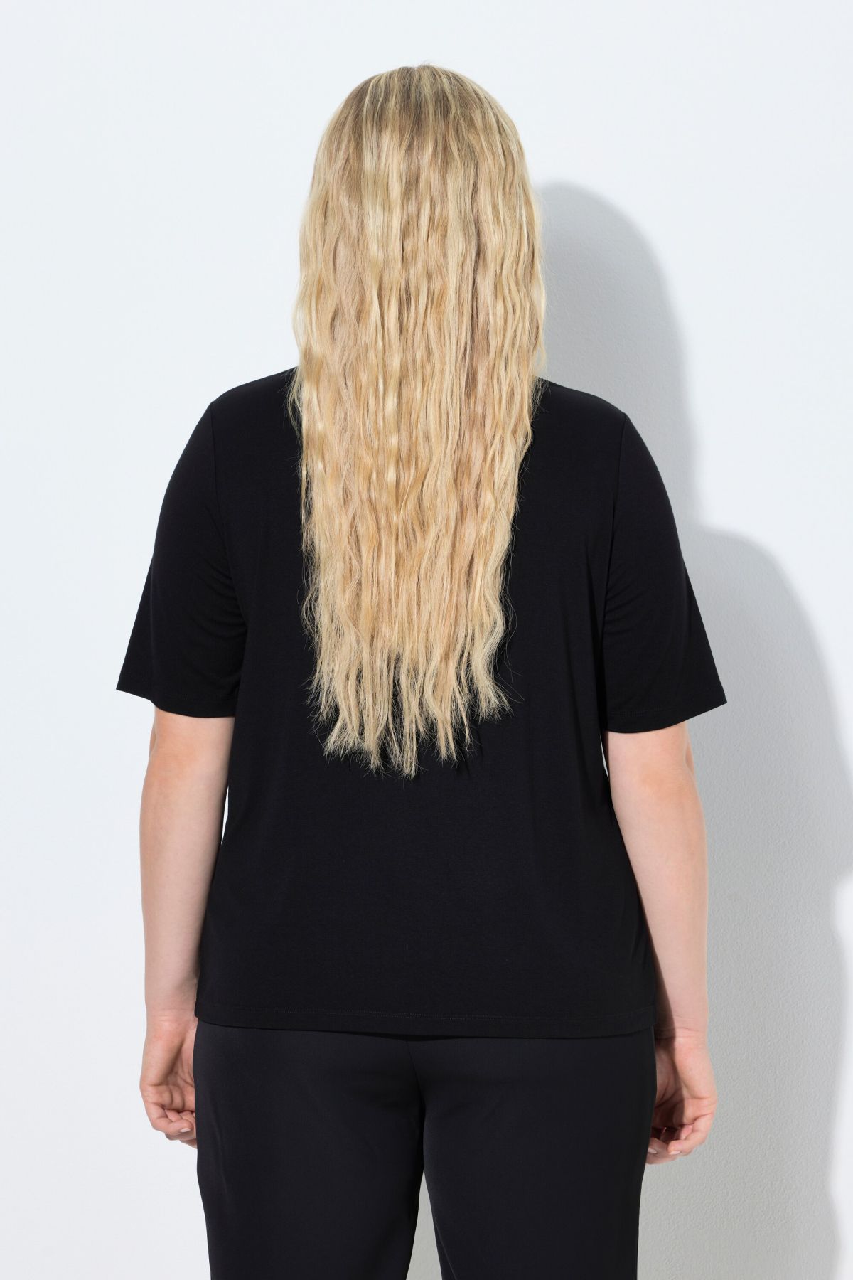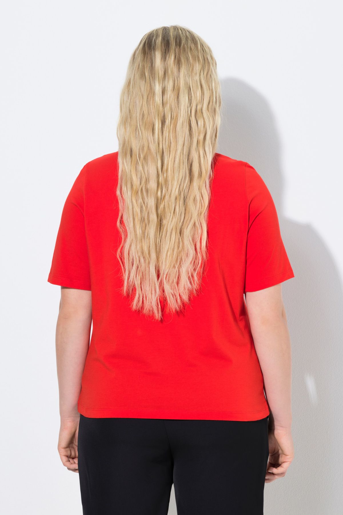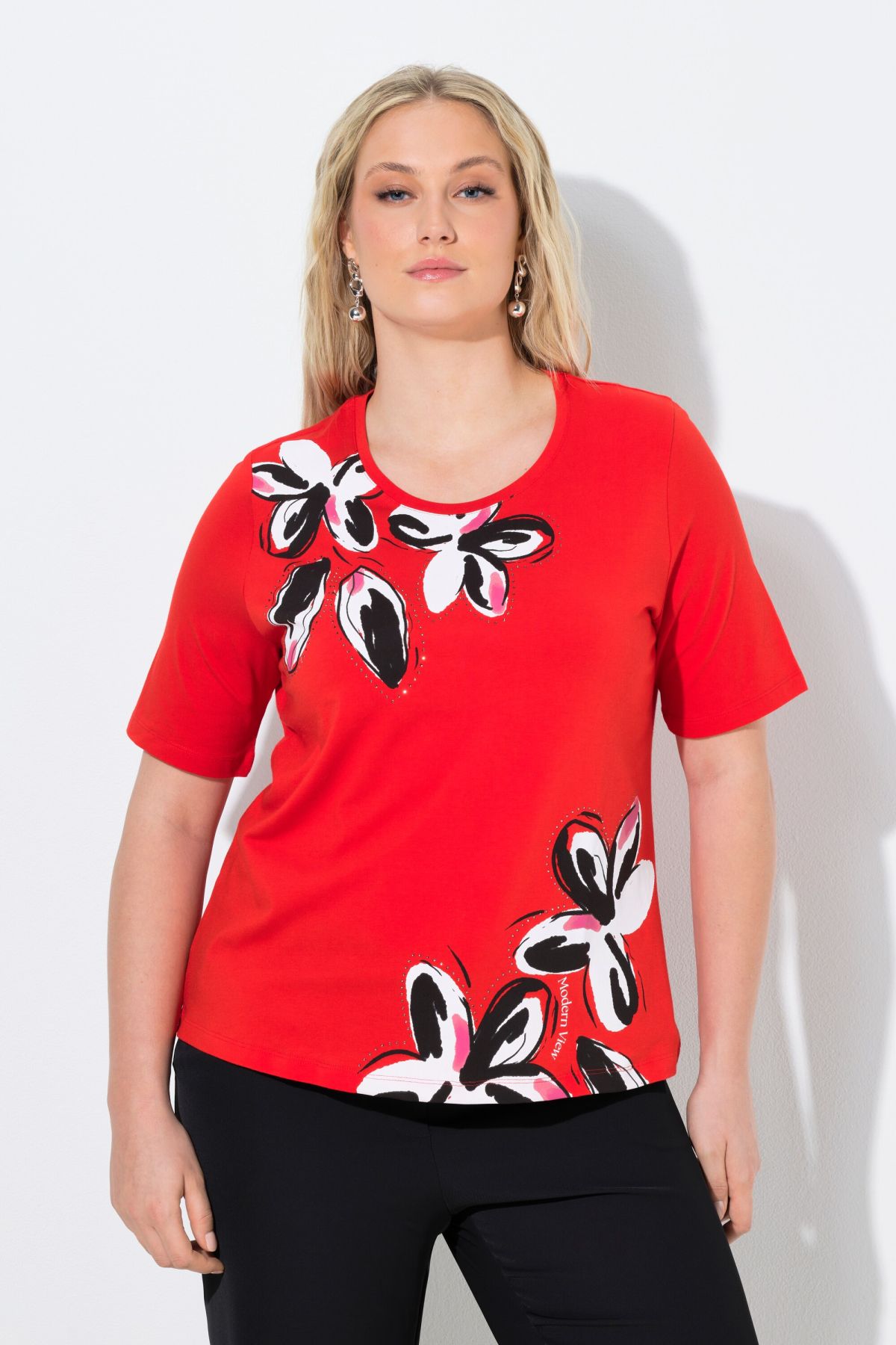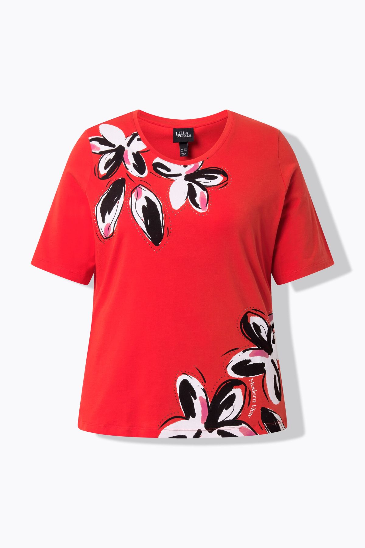Motif grandes fleurs, agrémentées de petits strass fantaisie, Décolleté rond, Coupe Classic Fit, Manches courtes, Coton naturel enrichi en élasthanne, Long. selon taille env. 62-72 cm.