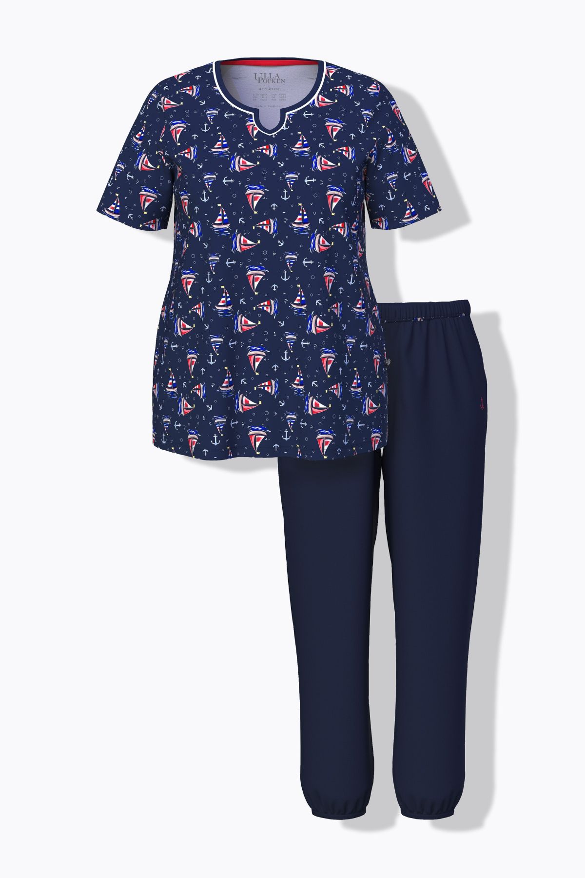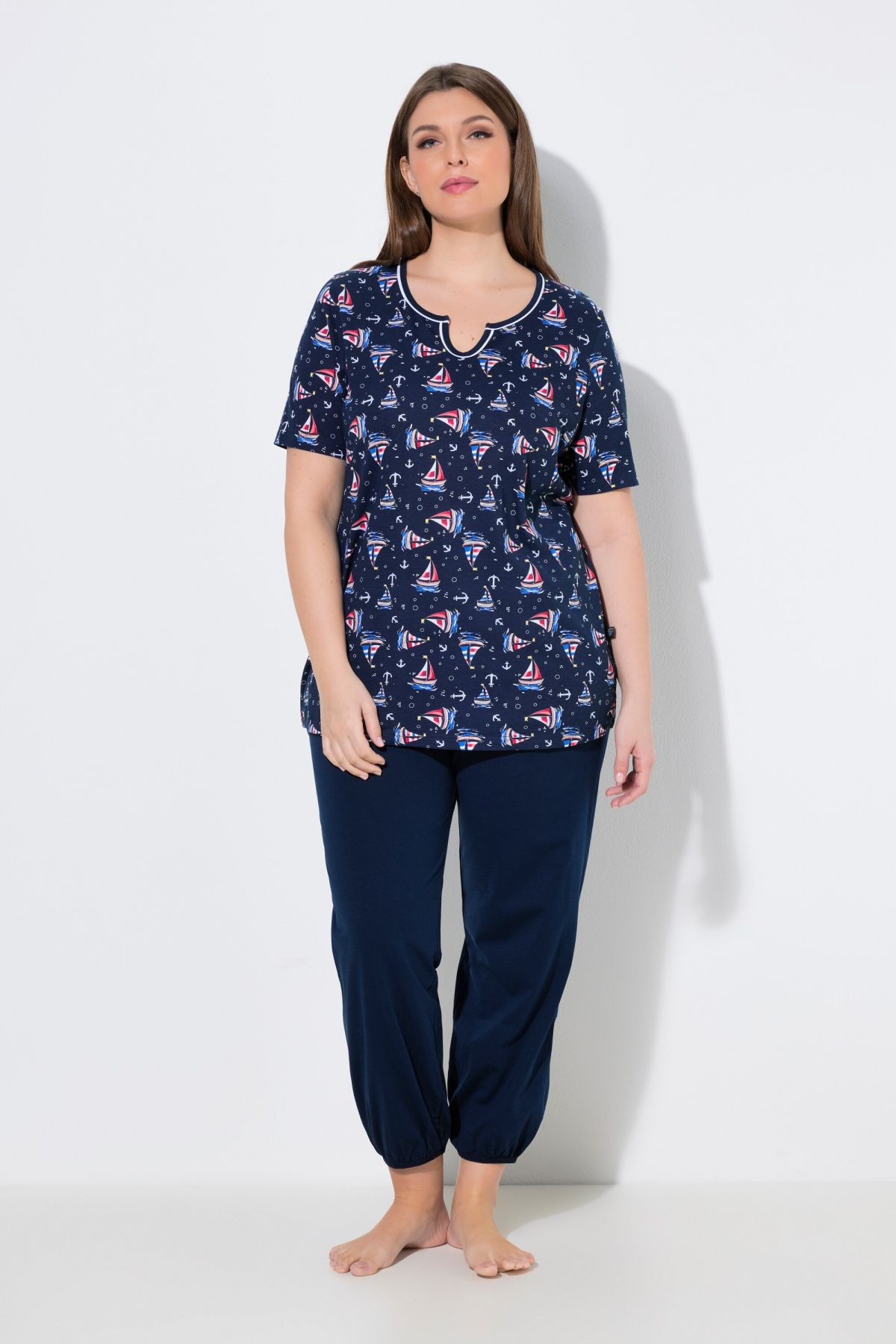 T-shirt avec motif voilier, Col tunisien très féminin, Pantalon confortable, jambe droite et taille élastique, Poches latérales réservées dans la couture, Coton respirant, Long. selon taille env. 68-76 cm.