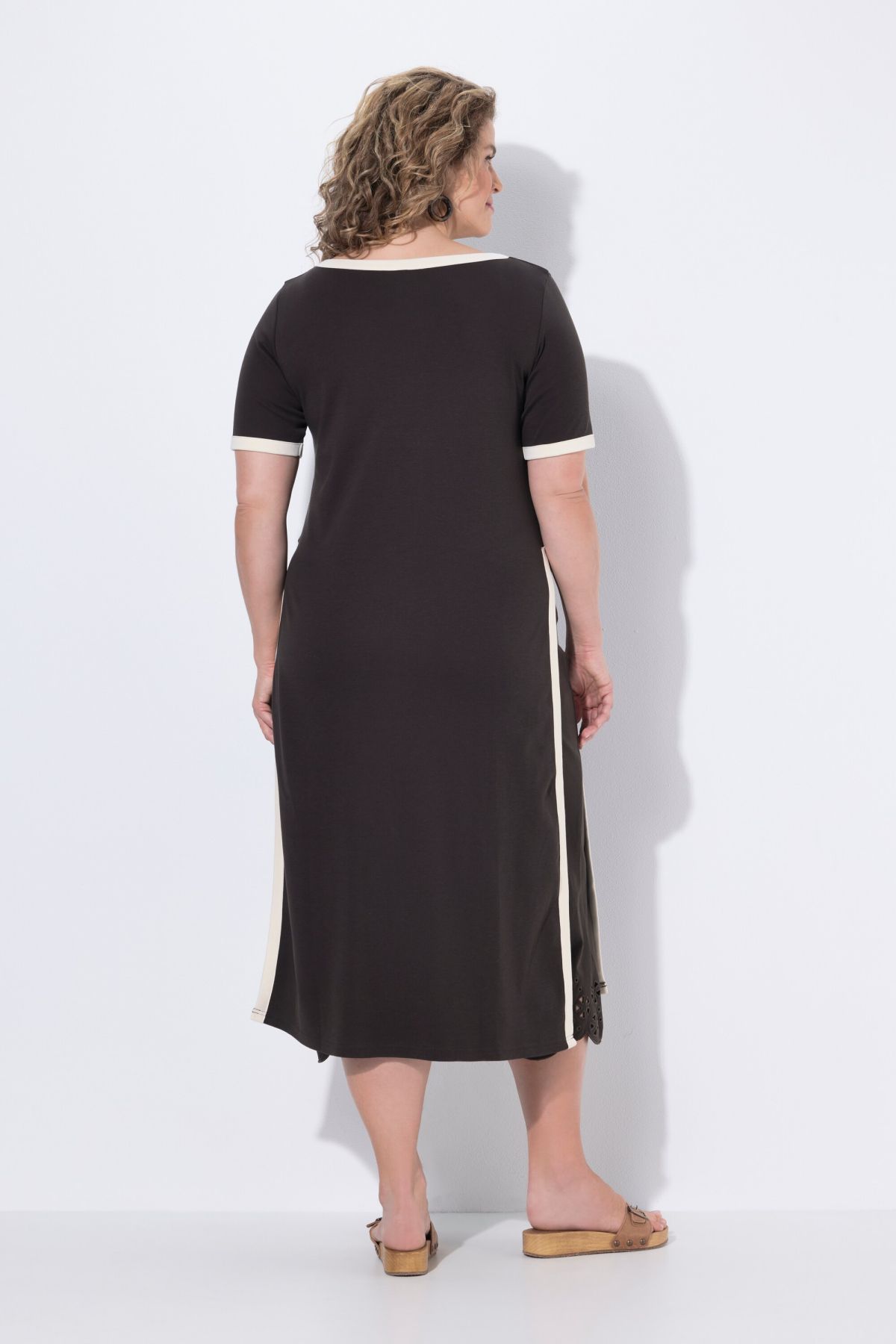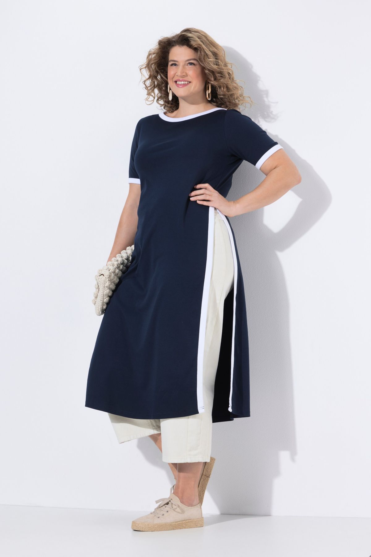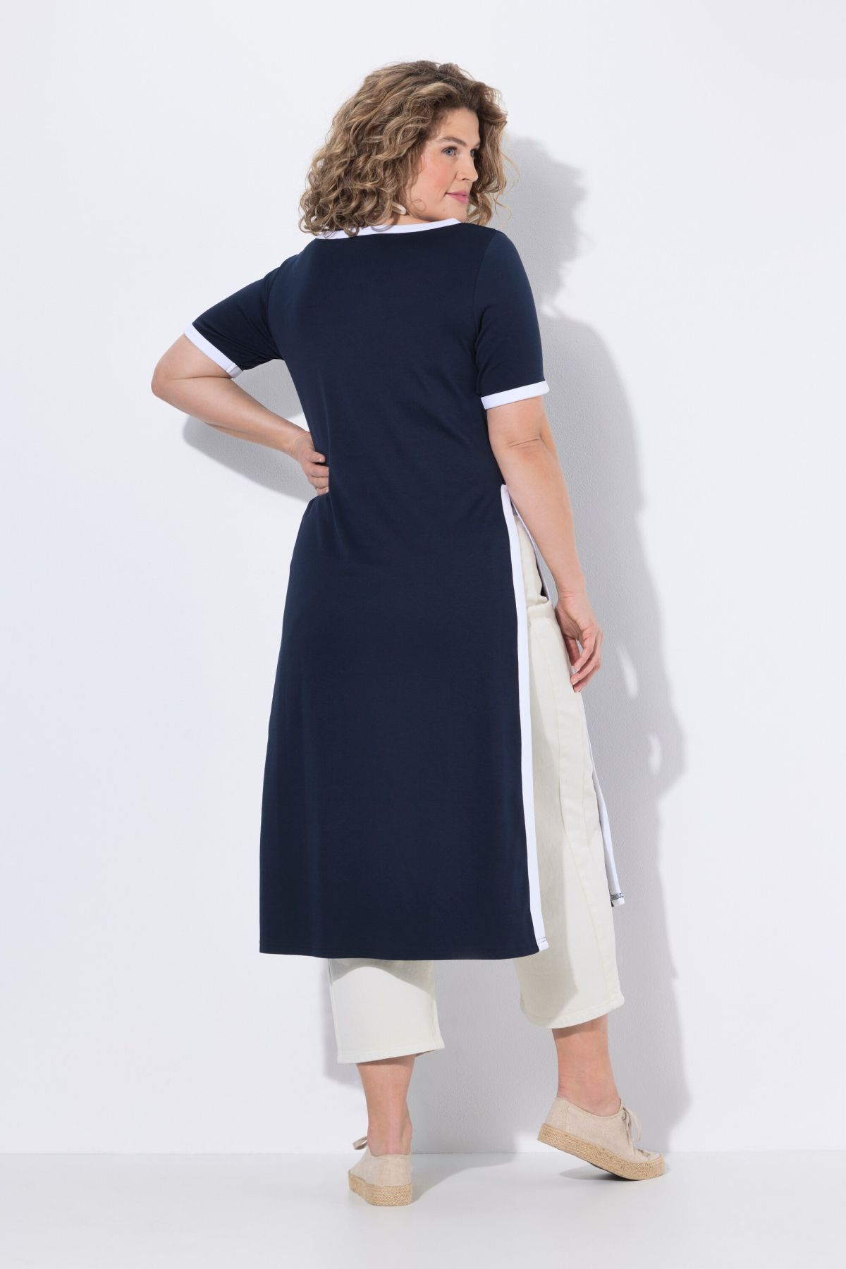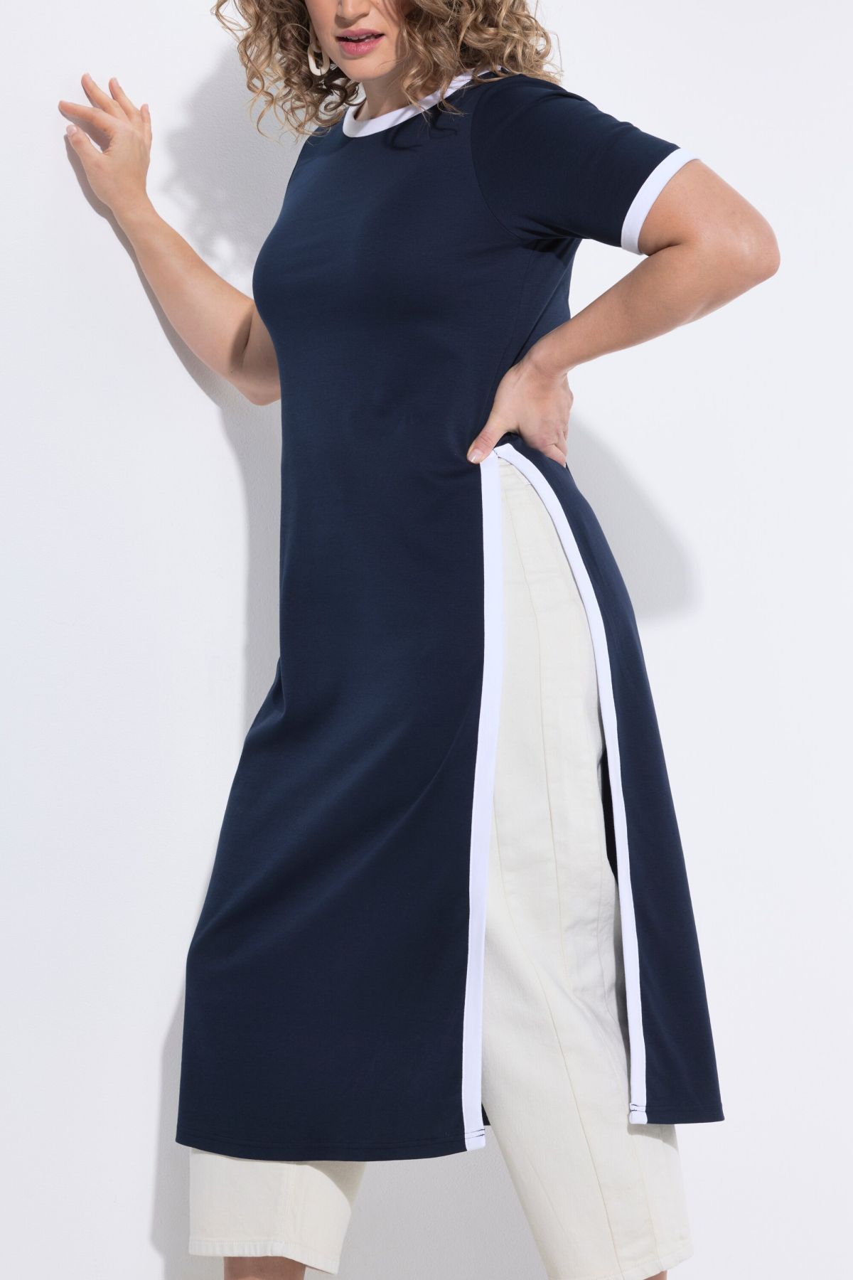Détails de couleur contrastante, Encolure bateau, Coupe droite, un plus longue que la normale, avec de profondes fentes sur les côtés, Modèles sans manches avec larges emmanchures, Coton bio durable, Long. env. 120 cm.