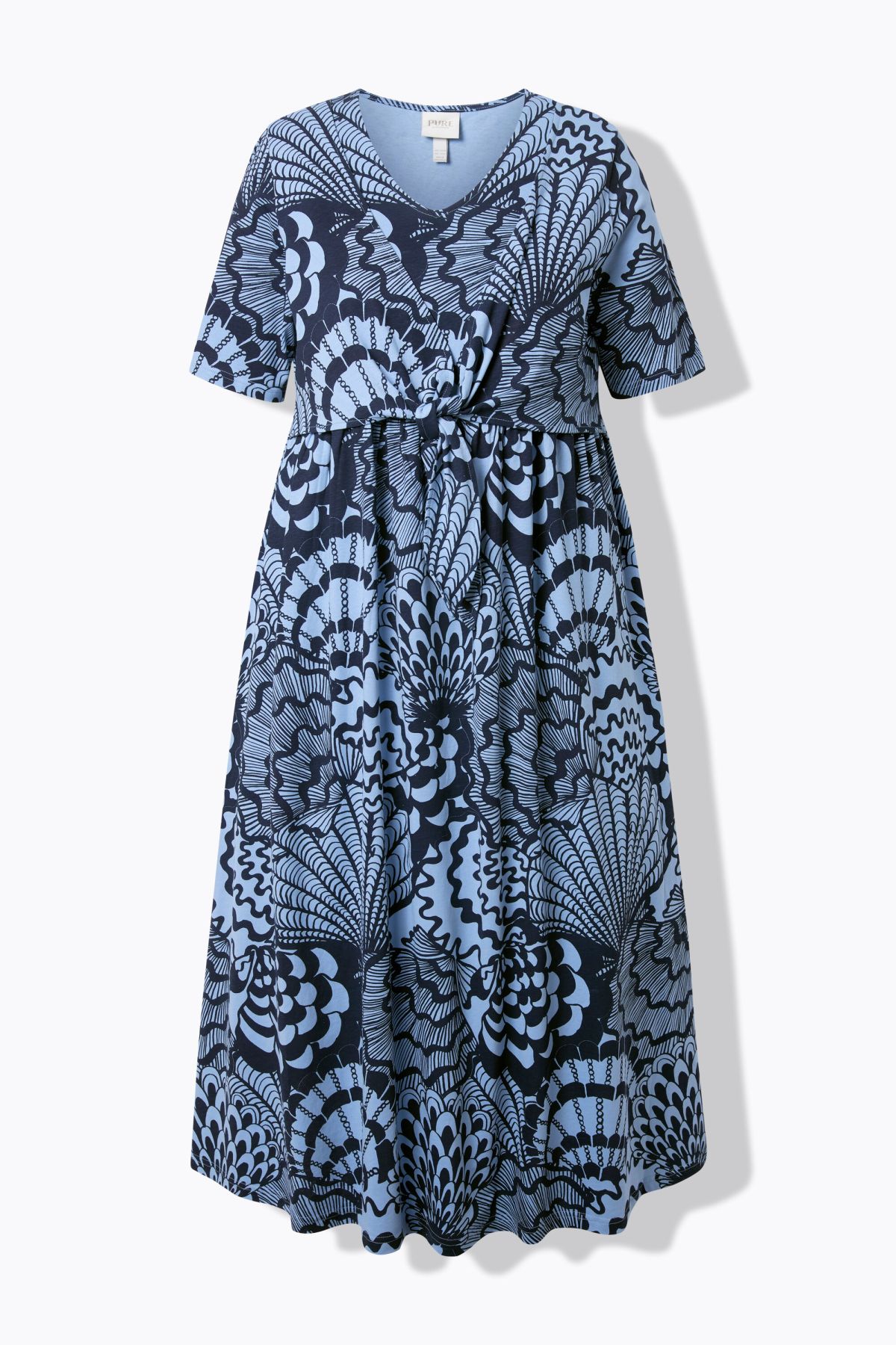 Jersey doux et confortable, motif grands coquillages, Décolleté en V féminin, esprit cache-cœur, Coupe évasée et couture empire, Manches courtes, Coton bio durable, Long. env. 126 cm.
