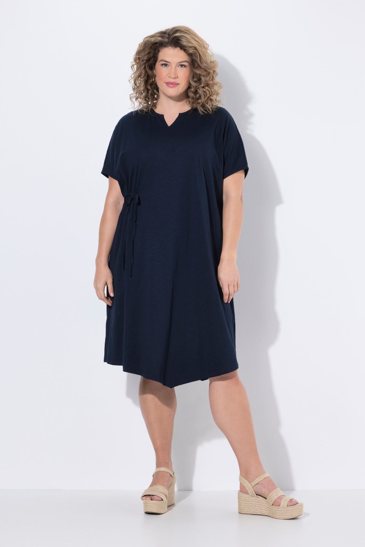 Drapé asymétrique, Col tunisien très féminin, Coupe oversize décontractée, base se terminant en pointe, Cordon de serrage coulissant sous tunnel à droite, Coton bio durable, Long. selon taille env. 110-114 cm.